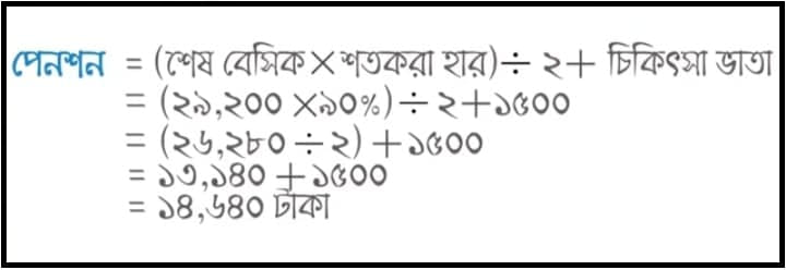 সুতরাং তাঁর পেনশন নির্ধারণ হবে: ২০০০+৫০০+১২৫০+১৮৭৫= ৫৬২৫ টাকা (আনুমানিক)।