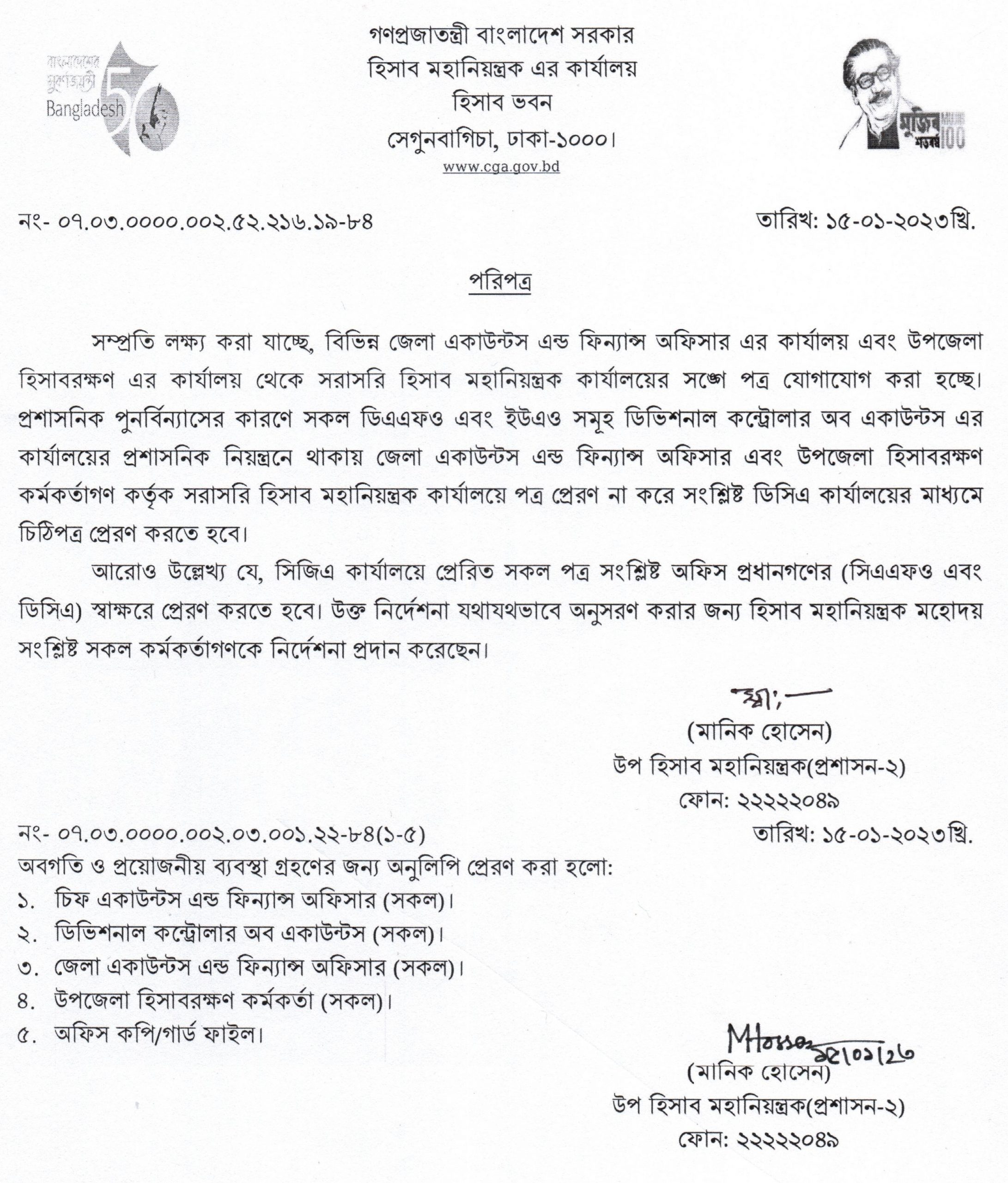 সরাসরি হিসাব মহানিয়ন্ত্রকের কার্যালয়ে পত্র প্রেরণ নির্দেশনা ২০২৩ । উপজেলা হিসাবরক্ষণ অফিস টু হিসাব মহানিয়ন্ত্রকের কার্যালয় পত্র প্রেরণ করা যাবে না