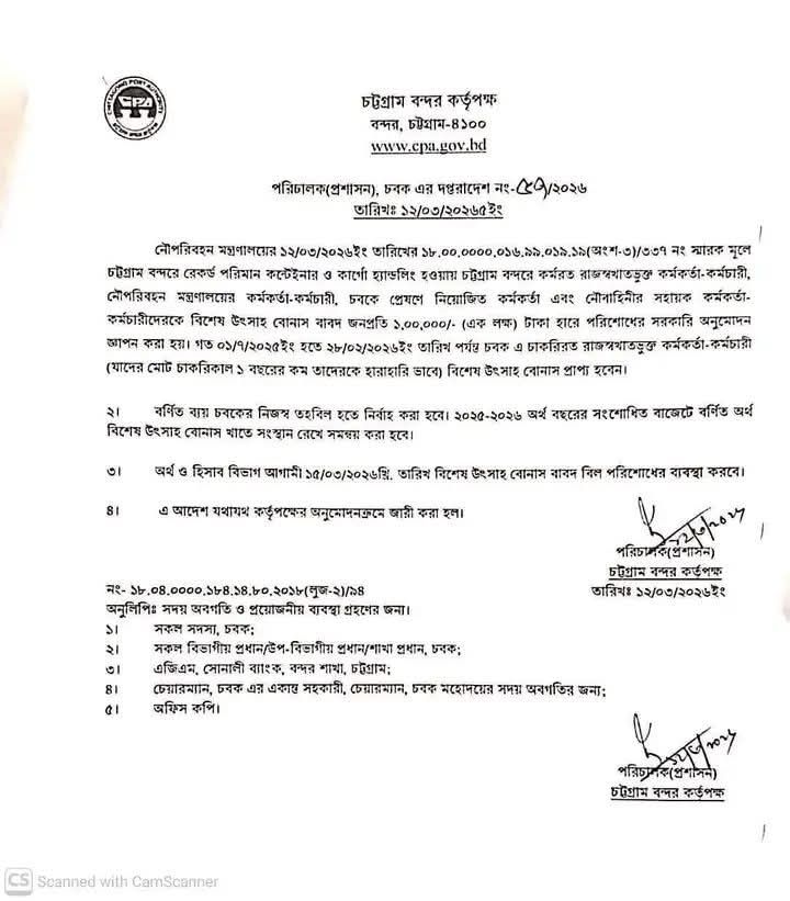 বন্দর কর্তৃপক্ষের অর্থ ও হিসাব বিভাগকে আগামী ১৫ মার্চ ২০২৬ তারিখের মধ্যে এই বোনাস সংক্রান্ত বিল পরিশোধের ব্যবস্থা গ্রহণের নির্দেশনা দেওয়া হয়েছে।