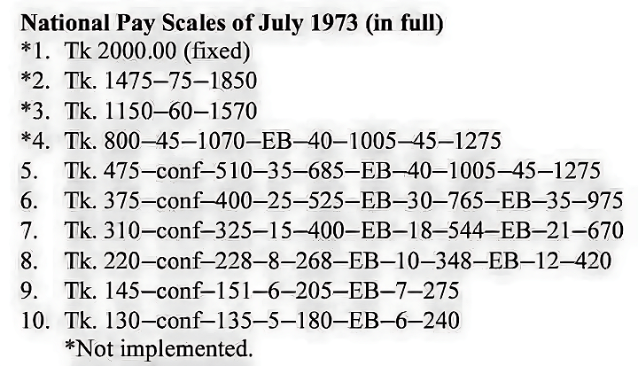 ১৯৭৩ সালের ১ম জাতীয় বেতন স্কেল (বাস্তবায়ন করা হয়নি) । বৈষম্য দূর করনে কমিটি গঠন করা হলেও তা আলোর মুখ দেখেনি