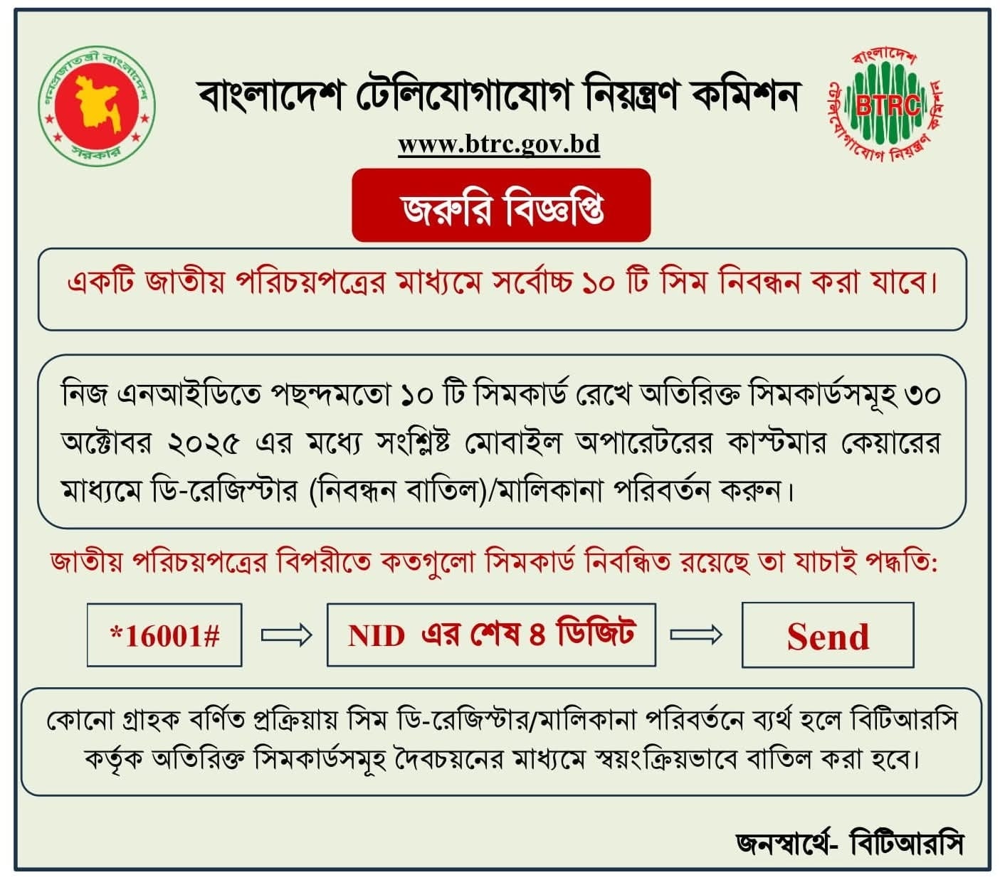 এই জরুরি বিজ্ঞপ্তির মাধ্যমে, বিটিআরসি দেশের মোবাইল গ্রাহকদের জাতীয় নিরাপত্তার স্বার্থে এবং ডিজিটাল সুরক্ষার জন্য দ্রুত তাদের সিমের নিবন্ধন সংখ্যা যাচাই ও সমন্বয় করার জন্য জোর দিয়েছে।