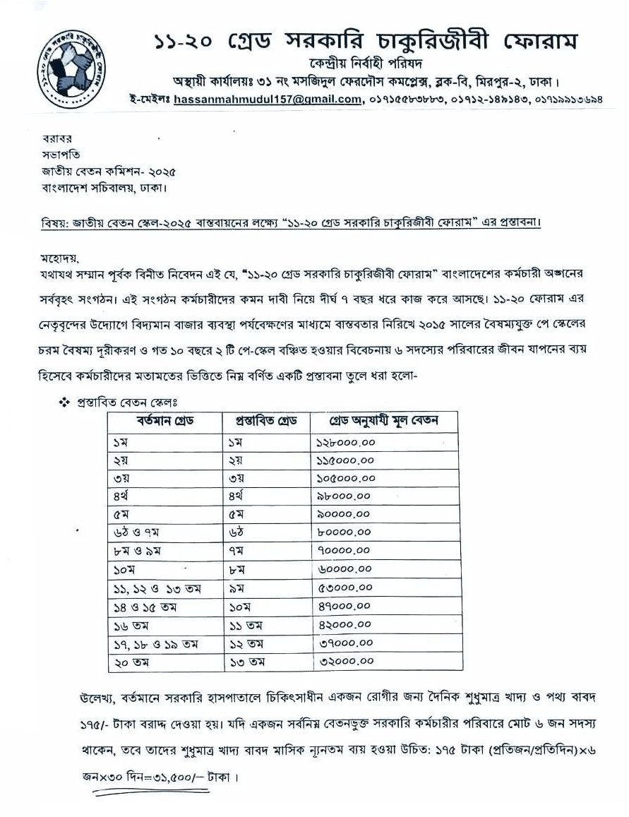 ১১-২০ গ্রেড সরকারি চাকরিজীবী ফোরামের পে স্কেলের প্রস্তাব ২০২৫ । সর্বনিম্ন মূল বেতন ৩২,০০০ টাকা করার দাবি সরকার কতটা শুনবে?