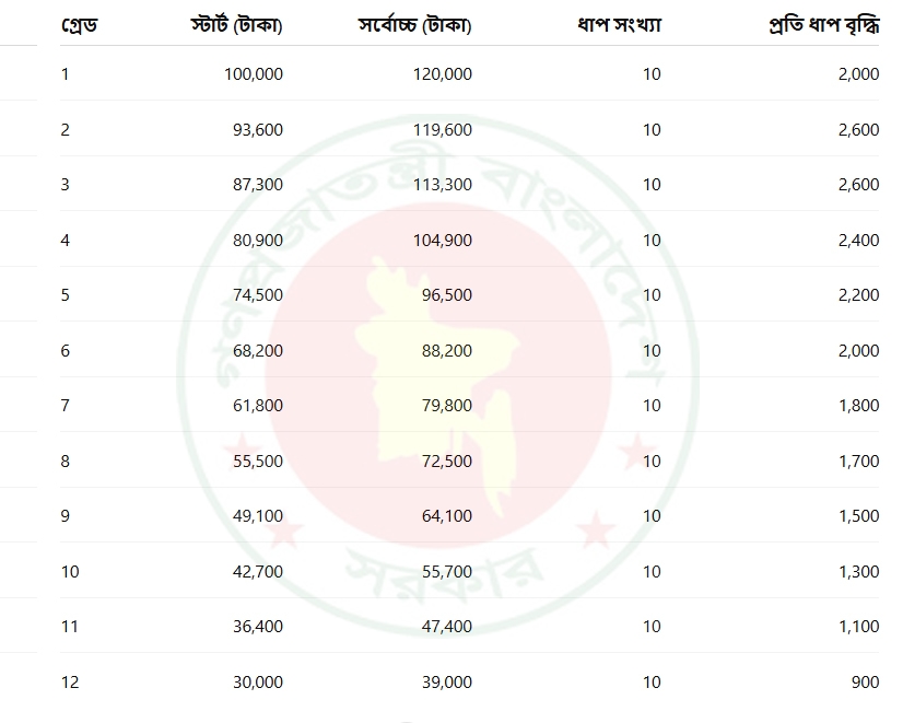 ব্যাখ্যা- এই টেবিলটি নীতিগত/খসড়া কাঠামো—বাস্তব প্রণয়নে গ্রেডের পরিসর, ধাপ সংখ্যা বা ধাপবৃদ্ধি পরিবর্তিত হতে পারে।