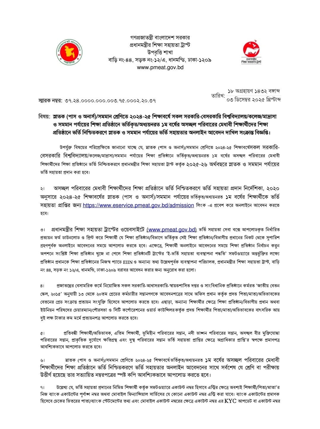 গণপ্রজাতন্ত্রী বাংলাদেশ সরকারের প্রধানমন্ত্রীর শিক্ষা সহায়তা ট্রাস্ট স্নাতক (পাস ও অনার্স)/সমমান শ্রেণিতে ২০২৪-২৫ শিক্ষাবর্ষে সকল সরকারি-বেসরকারি বিশ্ববিদ্যালয়/কলেজ/মাদ্রাসা ও সমমান পর্যায়ের শিক্ষা প্রতিষ্ঠানে ভর্তিকৃত/অধ্যয়নরত ১ম বর্ষের অসচ্ছল পরিবারের মেধাবী শিক্ষার্থীদের শিক্ষা প্রতিষ্ঠানে ভর্তি নিশ্চিতকরণের লক্ষ্যে ভর্তি সহায়তার অনলাইন আবেদন দাখিল সংক্রান্ত বিজ্ঞপ্তি প্রকাশ করেছে । ২০২৫-২৬ অর্থবছরে এই সহায়তা প্রদান করা হবে ।