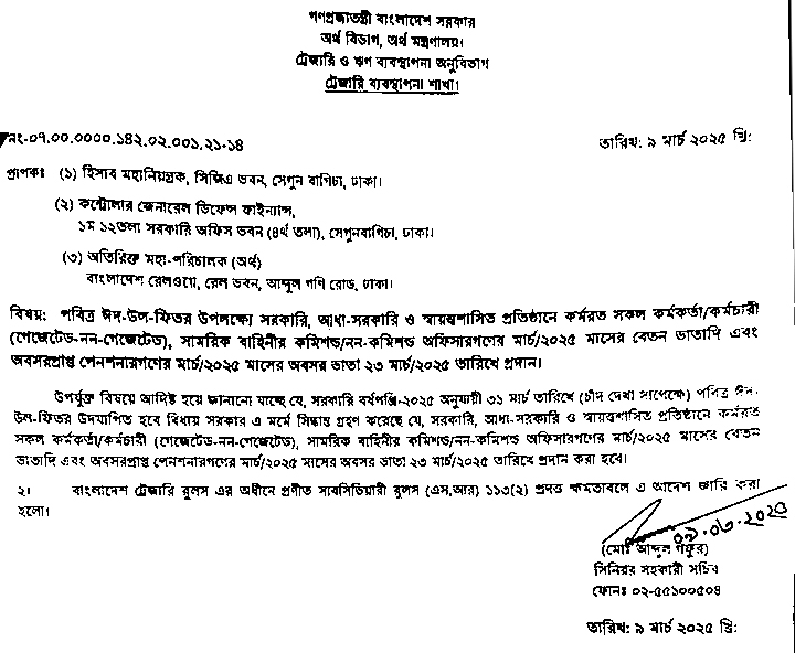 সরকারী, আধা সরকারী, স্বায়ত্বশাসিত প্রতিষ্ঠানের কর্মকর্তা/কর্মচারীর মার্চ/২০২৫ মাসের বেতন বিল এবং পেনশন দাখিল এবং ২৩-০৩-২০২৫ খ্রি. এর মধ্যে প্রদান সংক্রান্ত অর্থ মন্ত্রনালয়ের ০৯-০৩-২০২৫ খ্রি. এর নির্দেশনা।