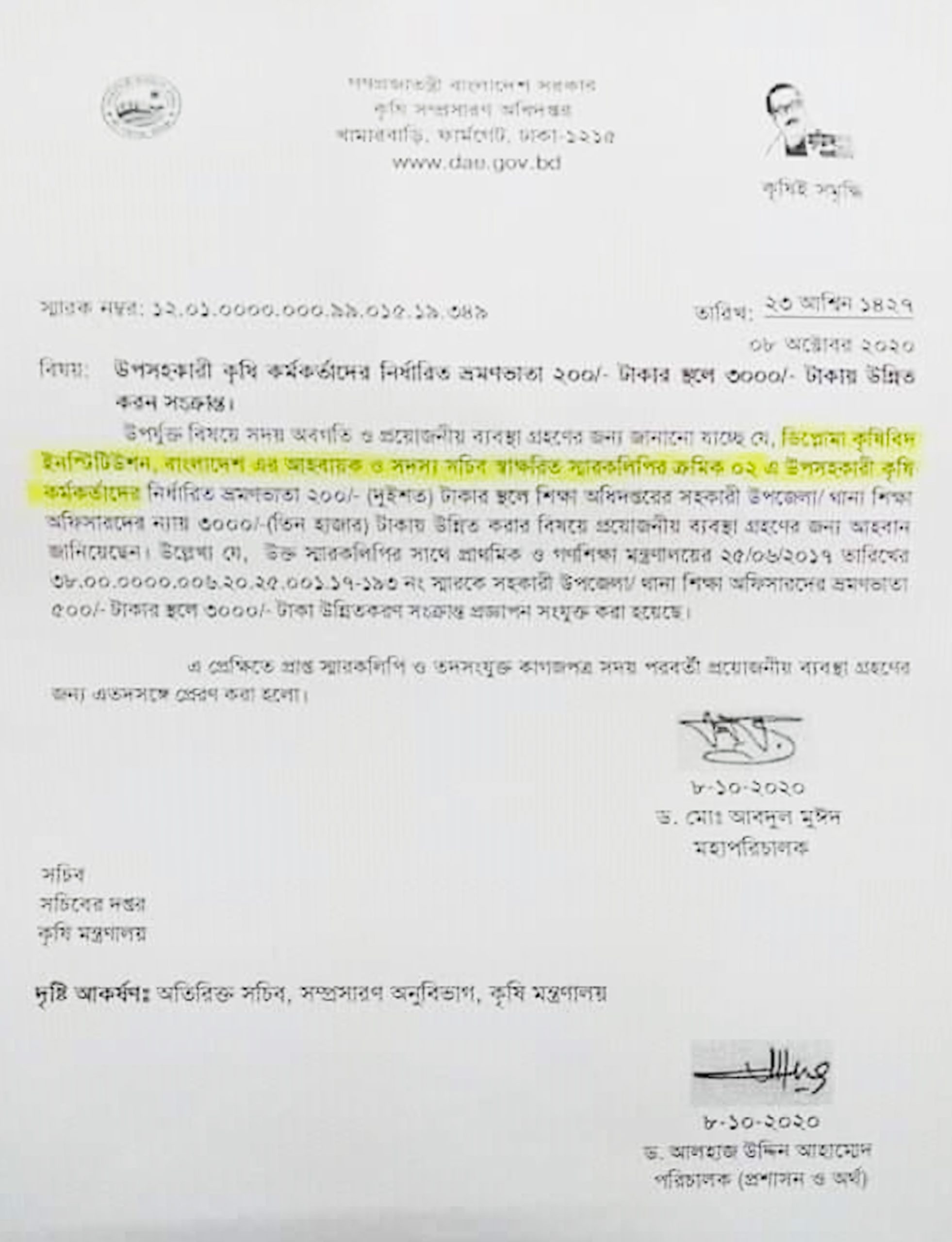 উপ-সহকারী কৃষি কর্মকর্তাদের ভ্রমণ ভাতা ২০০ হতে ৩০০০ টাকায় উন্নীত: ডাউনলোড