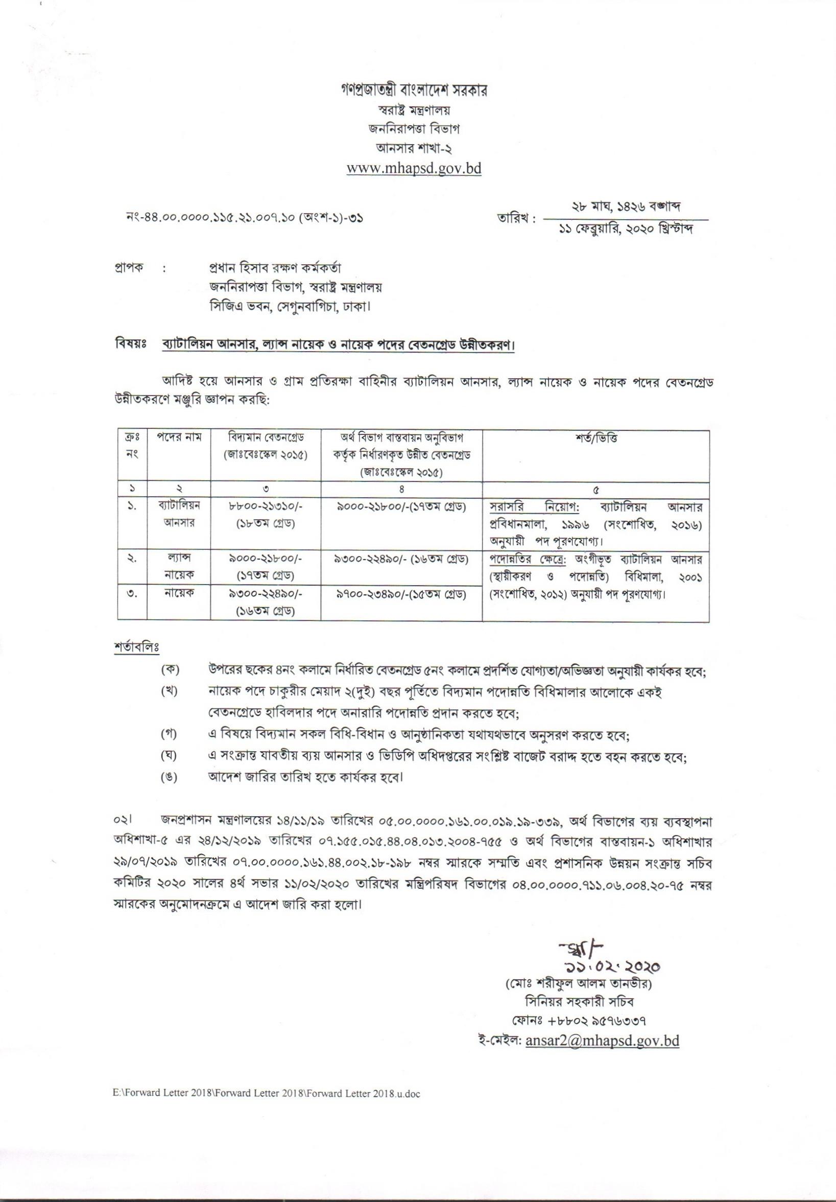 আদিষ্ট হয়ে আনসার ও গ্রাম প্রতিরক্ষা বাহিনীর ব্যাটালিয়ন আনসার, ল্যান্স নায়েক ও নায়েক পদের বেতনগ্রেড উন্নীতকরণে মঞ্জুরি জ্ঞাপন করছি: