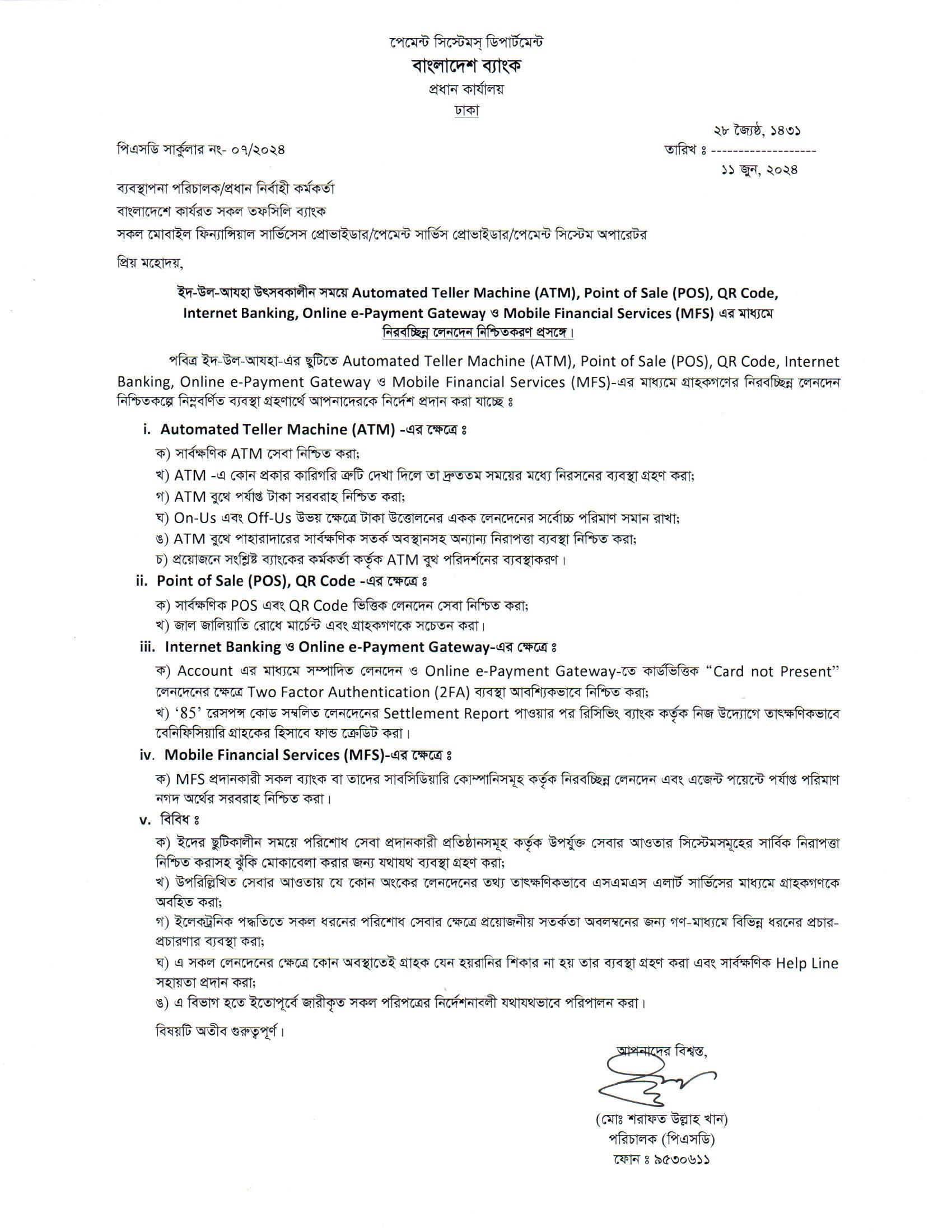 ঈদ-উল-আযহা উৎসবকালীন সময়ে ATM, POS, QR Code, Internet Banking, Online e-Payment Gateway ও MFS এর মাধ্যমে নিরবচ্ছিন্ন লেনদেন নিশ্চিতকরণ নির্দেশনা জারি করেছে বাংলাদেশ ব্যাংক- উৎসবকালীন ব্যাংক এটিএম ও MFS সেবা ২০২৫