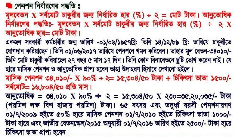 পেনশন নির্ধারণের পদ্ধতি বা সূত্র কি? পেনশন নির্ধারণের মূল সূত্রটি হলো: মূল বেতন × মোট চাকরির জন্য নির্ধারিত হার (%) ÷ ২ = মোট টাকা । আনুতোষিক নির্ধারণের পদ্ধতি আনুতোষিক (Gratuity) নির্ধারণের পদ্ধতি হলো: মূল বেতন × মোট চাকরির জন্য নির্ধারিত হার (%) ÷ ২ × আনুতোষিক হার = মোট টাকা । একটি উদাহরণ হিসাবে, একজন সরকারি কর্মচারী যার মূল বেতন ৩৪,০১০ টাকা এবং যিনি ২৭ বছর ৫ মাস ১৭ দিন চাকরি করেছেন, তিনি মাসিক পেনশন এবং আনুতোষিক নিম্নোক্ত হারে প্রাপ্য হবেন: মাসিক পেনশন: ৩৪,০১০ টাকা × ৯০% ÷ ২ = ১৫,৩০৪.৫০ টাকা । এর সাথে ১৫০০ টাকা চিকিৎসা ভাতা যুক্ত হবে, ফলে মোট মাসিক প্রাপ্তি হবে ১৬,৮০৪.৫০ টাকা । আনুতোষিক: ৩৪,০১০ টাকা × ৯০% ÷ ২ = ১৫,৩০৪.৫০ টাকা । আনুতোষিক হার ২৩০ ধরে মোট আনুতোষিক হবে ১৫,৩০৪.৫০ টাকা× ২৩০ = ৩৫,২০,০৩৫ টাকা ।
