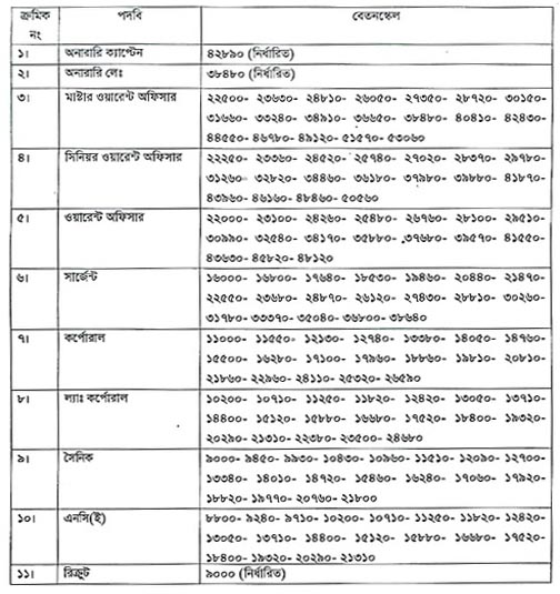 ব্রিগেডিয়ার জেনারেল/কমডোর/এয়ার কমডোর পদের বেতন ৬৩ হাজার ৫৭০ টাকা। কর্নেল/ক্যাপ্টেন (নৌ)/গ্রুপ ক্যাপ্টেন পদের বেতন ৬১ হাজার টাকা। লে. কর্নেল/কমান্ডার/উইং কমান্ডারের বেতন ৫০ হাজার টাকা। মেজর/লে. কমান্ডার/স্কোয়াড্রন পদের বেতন নির্ধারণ করা হয়েছে ৪৩ হাজার টাকা।