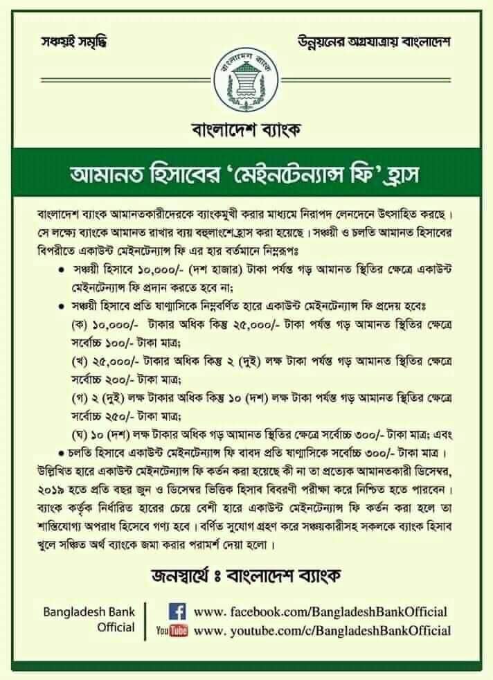 আমানত হিসাবের মেইনটেন্যান্স ফি হ্রাস সংক্রান্ত আদেশ টি সংগ্রহে রাখতে পারেন: ডাউনলোড