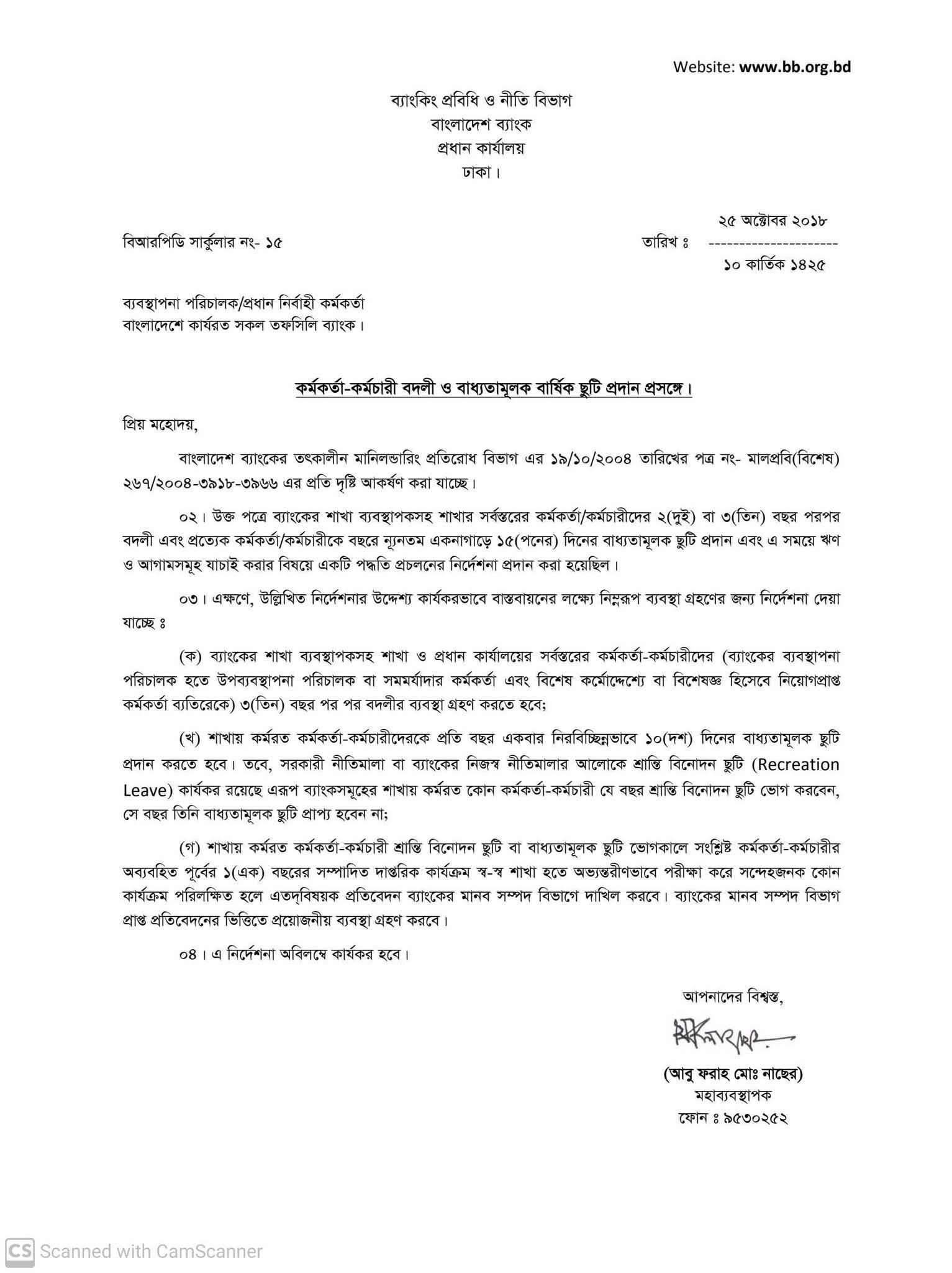 কর্মকর্তা-কর্মচারী বদলি ও বাধ্যতামূলক বার্ষিক ছুটি প্রদান সংক্রান্ত বাংলাদেশ ব্যাংকের এক প্রজ্ঞাপনে দেশের শাখাগুলোতে কর্মরত কর্মকর্তা-কর্মচারীদের জন্য প্রতি বছর নিরবচ্ছিন্নভাবে ১০ (দশ) দিনের বাধ্যতামূলক ছুটি (Recreation Leave) ভোগ করা আবশ্যক করা হয়েছে। এ সংক্রান্ত সার্কুলারটি ২০ অক্টোবর ২০২৪ তারিখে জারি করা হয়েছে।