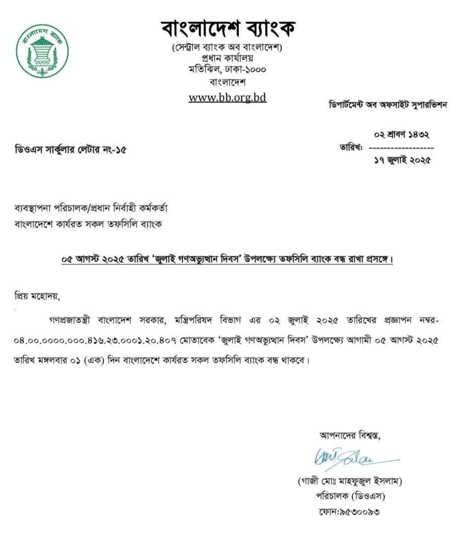 বাংলাদেশ ব্যাংক পত্র জারির মাধ্যমে ৫ আগস্ট ব্যাংক বন্ধ থাকবে বলে ঘোষণা করেছে / ৫ ই আগস্ট জুলাই গণঅভ্যুত্থান দিবস হিসেবে সরকারি ছুটি