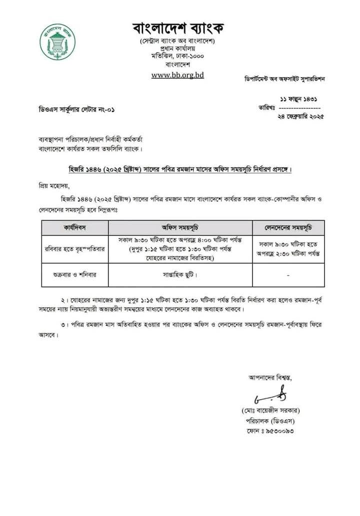 জনগনের সাথে লেনদেন সূচী– আগামী ০২ মার্চ হতে ব্যাংকে লেনদেন হবে সকাল ১০টা থেকে বেলা ২.৩০ টা পর্যন্ত। আর ব্যাংকের কর্মকর্তাদের অফিস সময় হবে সকাল ৯.৩০ টা থেকে বিকেল ৪টা পর্যন্ত। গতকাল রমজানের জন্য নতুন–সংক্রান্ত নির্দেশনা জারি করেছে বাংলাদেশ ব্যাংক এবং এটি পুরো রমজানে কার্যকর থাকবে।