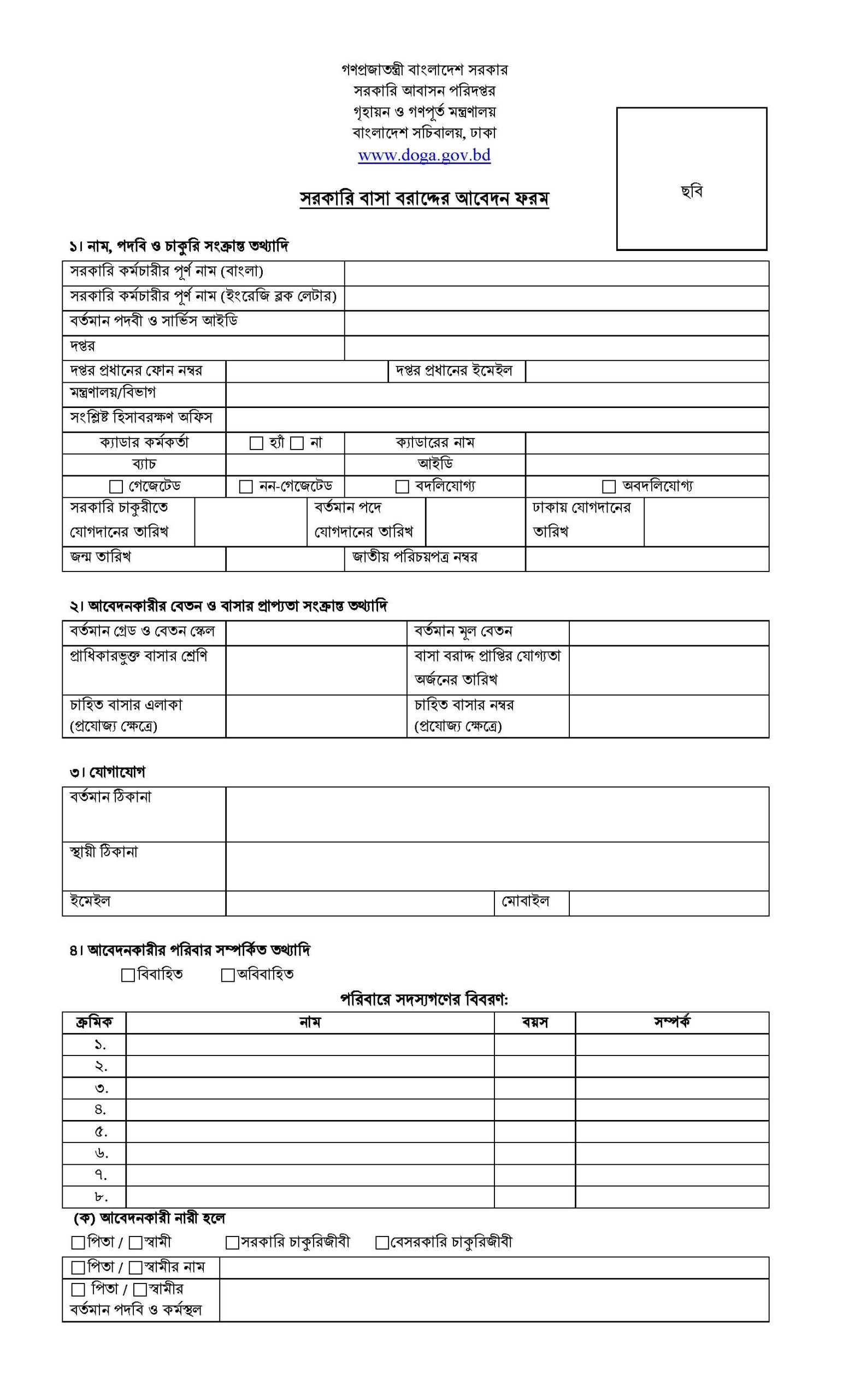 সরকারি বাসা বরাদ্দের আবেদন ফরম (দুই কপি)