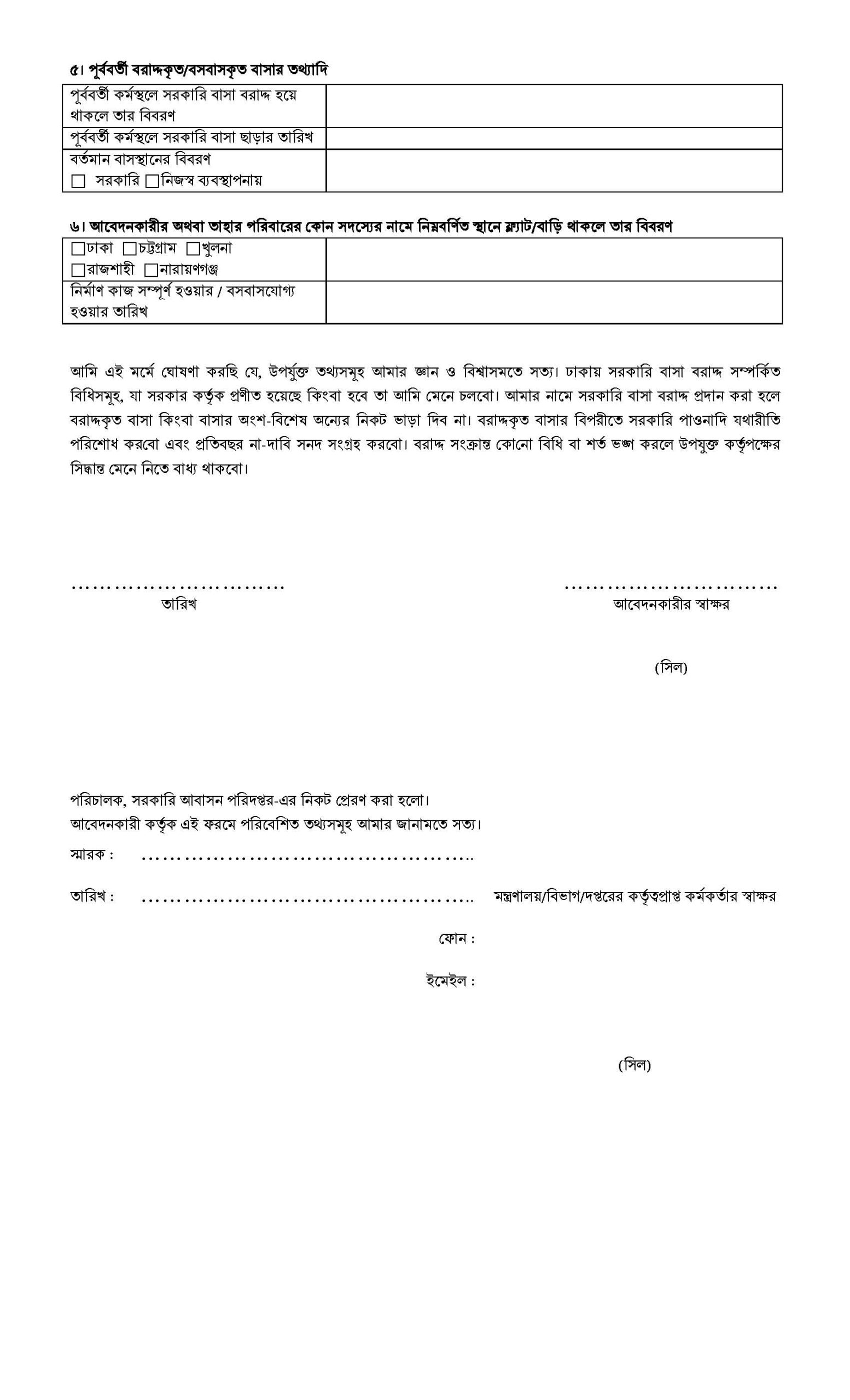 আমি প্রত্যয়ন করিতেছি যে, উপর্যুক্ত তথ্যসমূহ আমার সর্বোচ্চ জ্ঞান ও বিশ্বাসমতে সত্য। ঢাকায় সরকারি বাসা বরাদ্দ সম্পর্কিত বিধিসমূহ যাহা সরকার কর্তৃক প্রণীত হইয়াছে বা হইবে তাহা আমি মানিয়া চলিব। আমার নামে সরকারি বাসা বরাদ্দ করা হইলে উহা বা উহার অংশ বিশেষ অন্যের নিকট ভাড়া দিব না। বরাদ্দ সংক্রান্ত কোনো বিধি বা শর্ত ভঙ্গ করিলে উপযুক্ত কর্তৃপক্ষের যে কোন সিদ্ধান্ত মানিয়া নিতে বাধ্য থাকিবে।