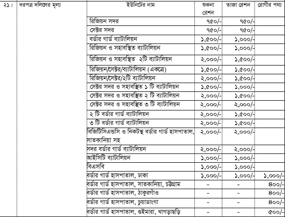 বর্ডার গার্ড বাংলাদেশ এর সদস্যদের জন্য শুকনা ও তাঁজা রেশন এবং বর্ডার গার্ড হাসপাতাল, ঢাকা, সাতকানিয়া, চট্টগ্রাম, ঠাকুরগাঁও, চুয়াডাংগা , গুইমারা, খাগড়াছড়ি এর রোগীদের পথ্য সরবরাহ করণ তালিকা দেখুন