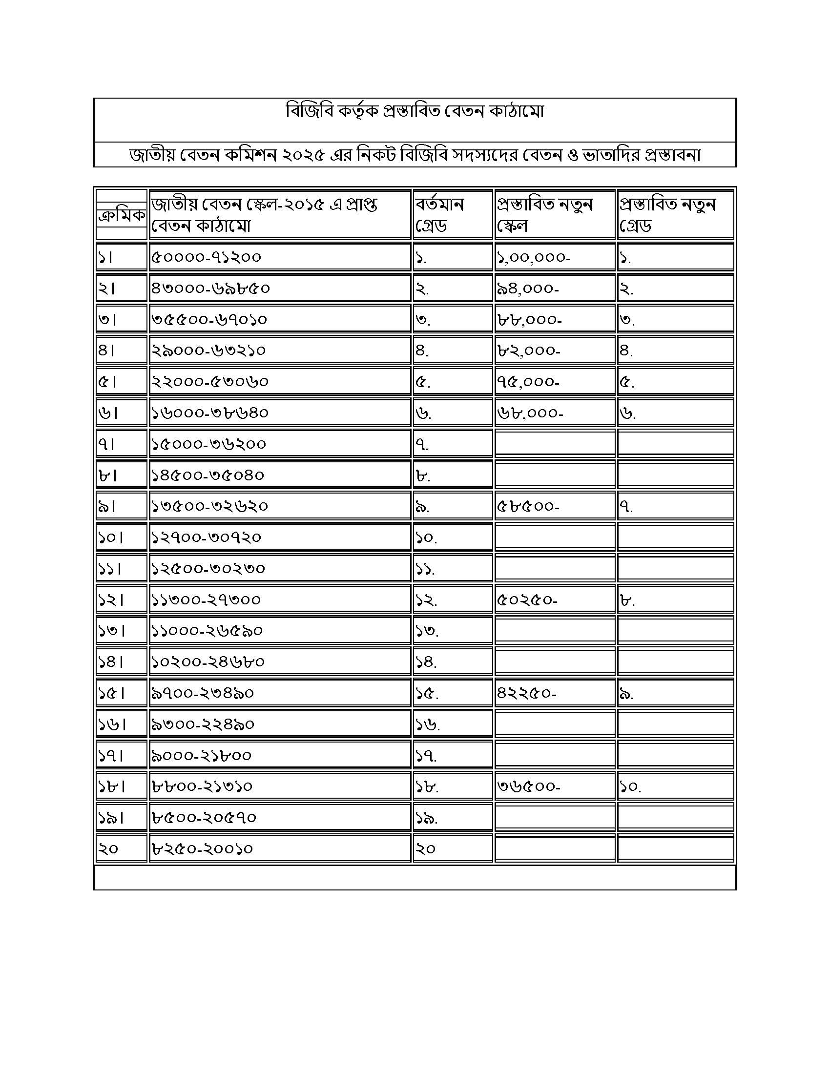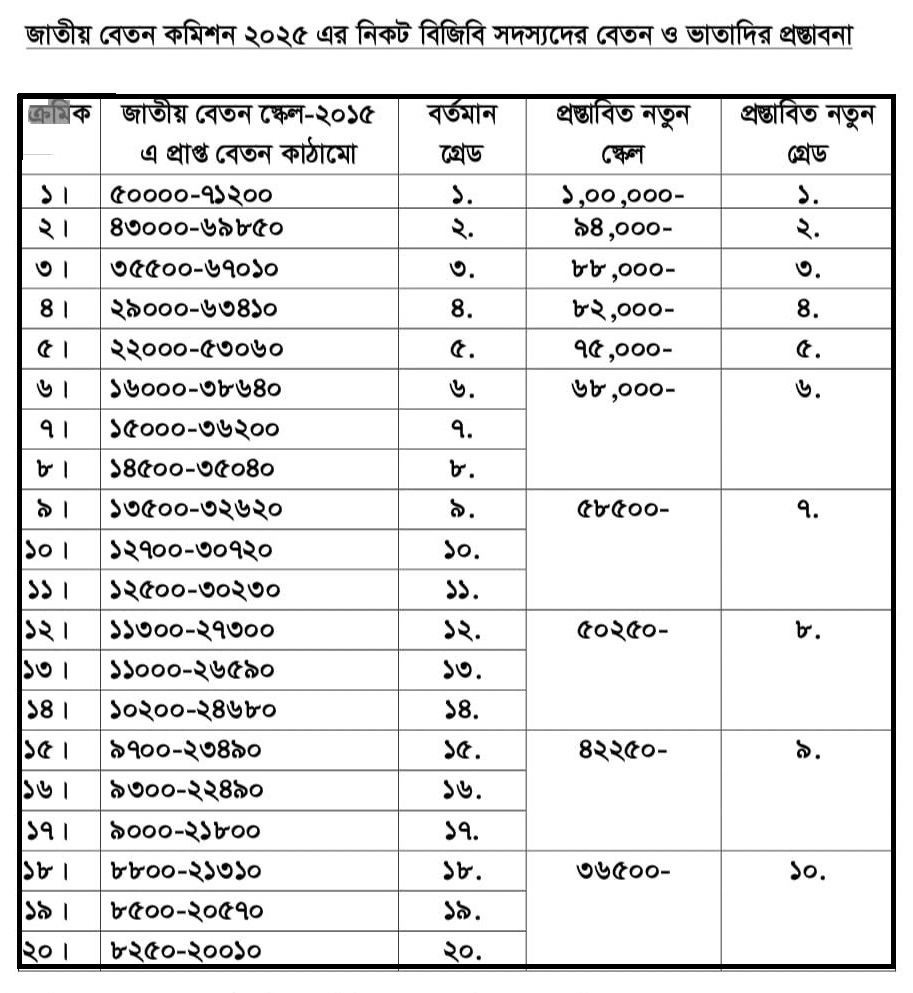 বিজিবি প্রস্তাবিত নতুন স্কেল ২০২৫ । প্রতি বছর মুল বেতনের উপর ১০% বেতন বৃদ্ধির প্রস্তাব করা হয়েছে।
