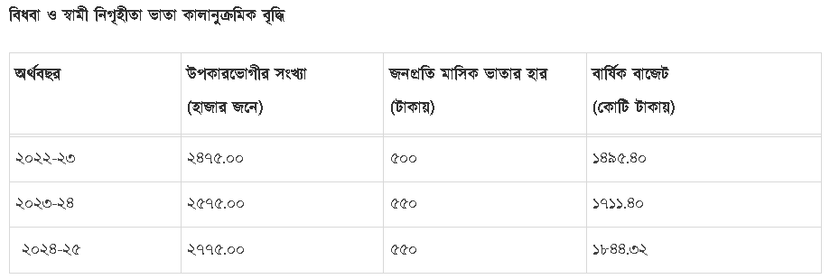 | অর্থবছর | উপকারভোগীর সংখ্যা (হাজার জনে) | জনপ্রতি মাসিক ভাতার হার (টাকায়) | বার্ষিক বাজেট (কোটি টাকায়) |