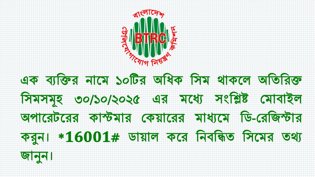 সিম নিবন্ধন সম্পর্কিত সরকারি পরিপত্র । ১০টির বেশি সিম থাকলে আপনার নামে তা বন্ধ করতে হবে । ৩০/১০/২০২৫ তারিখের মধ্যে অতিরিক্ত সিম ডি-রেজিস্ট্রেশন সম্পন্ন করতে হবে অন্যথায় দৈবচয়ন পদ্ধতে সিম বন্ধ প্রক্রিয়া শুরু হবে।