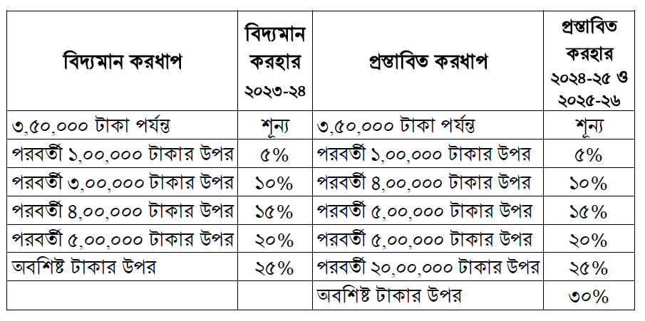 নতুন বাজেটে কর স্ল্যাব কি বৃদ্ধি করা হলো? হ্যাঁ। স্বাভাবিক ব্যক্তি করদাতা ও ফার্মের করধাপ সমন্বয়পূর্বক বিদ্যমান সর্বোচ্চ করহার ২৫ শতাংশ থেকে বৃদ্ধি করে ৩০ শতাংশে নির্ধারণ করা হয়েছে।
