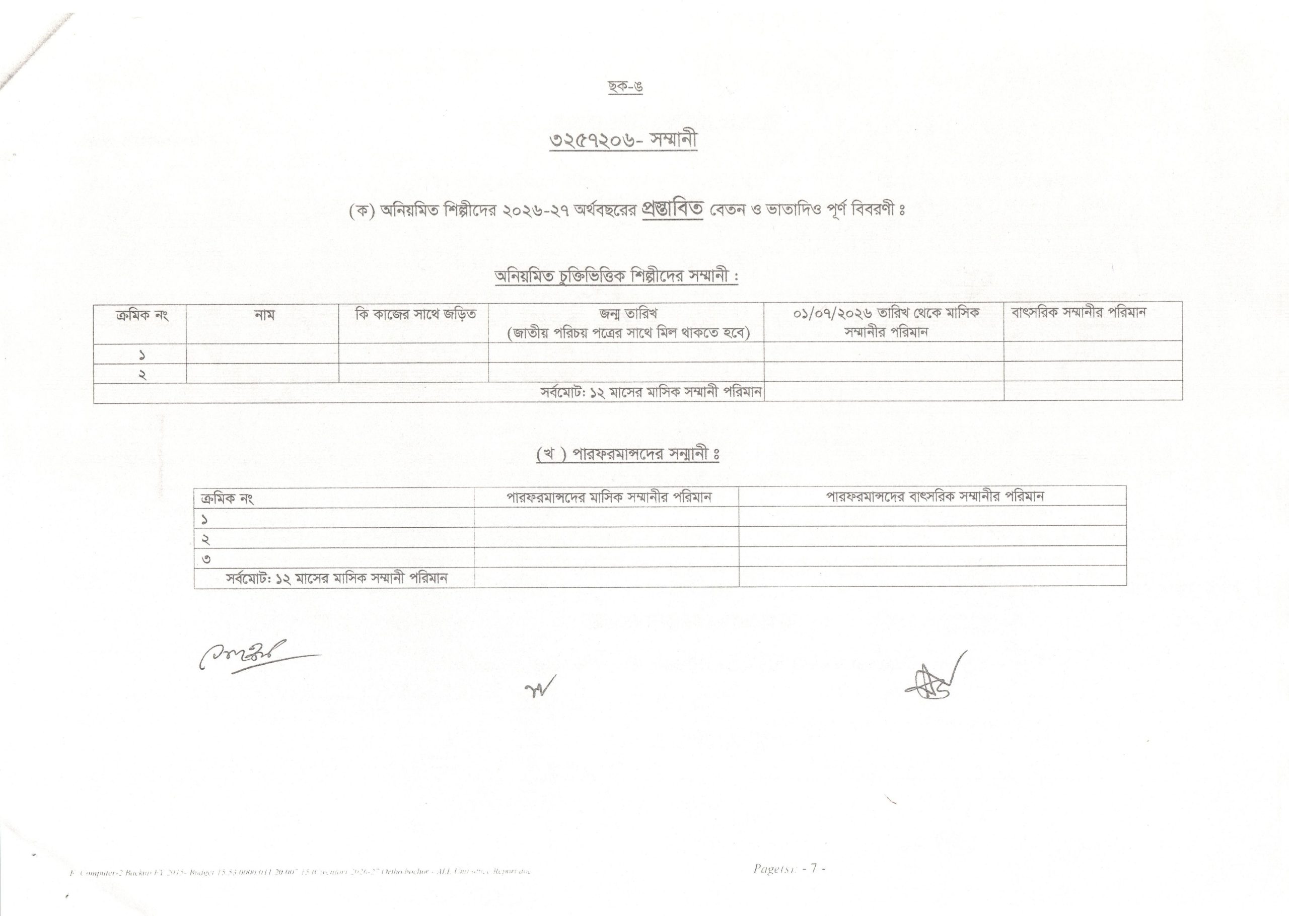- ছক-ঙ (৩২৫৭২০৬-সম্মানী): এই ছকে অনিয়মিত শিল্পী ও পারফরমান্সদের ২০২৬-২৭ অর্থবছরের প্রস্তাবিত মাসিক ও বাৎসরিক সম্মানীর পূর্ণ বিবরণী জমা দিতে হবে।
