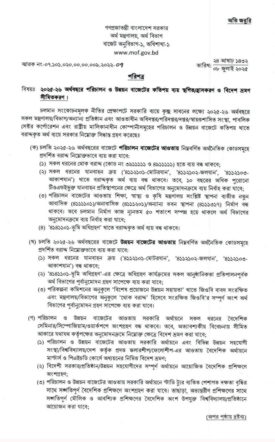 - চলতি ২০২৫-২৬ অর্থবছরে পরিচালন ও উন্নয়ন বাজেটের আওতায় সকল প্রকার বৈদেশিক ভ্রমণ/ওয়ার্কশপ/সেমিনারে অংশগ্রহণ বন্ধ থাকবে।