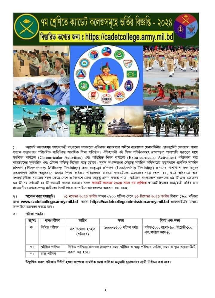 বাংলাদেশের ১২টি ক্যাডেট কলেজে ভর্তির জন্য অনলাইনে আবেদন করতে হবে- ভর্তির নিয়ম, পদ্ধতি, যোগ্যতা, ফিস ইত্যাদি দেখুন – Cadet College Admission Circular 2024