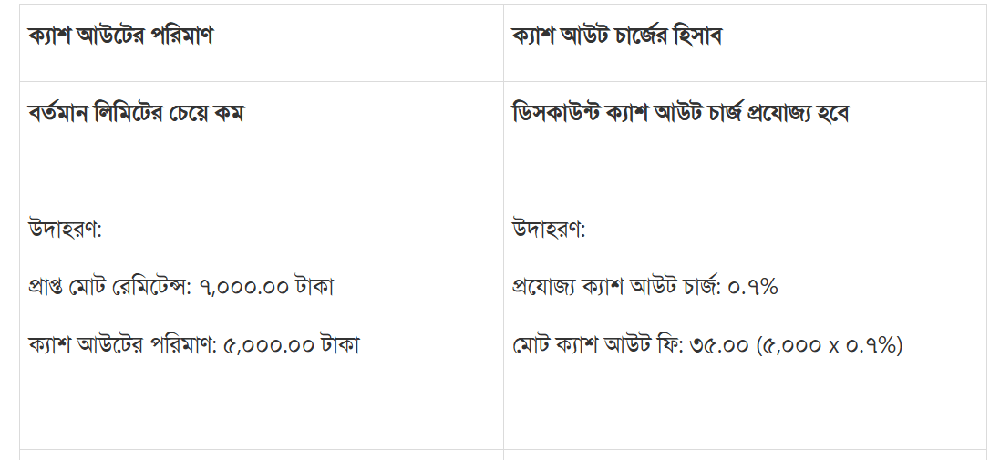 ক) সামাজিক নিরাপত্তা কর্মসূচী ও সরকারের অন্যান্য নগদ অর্থ Mobile Financial Services এর মাধ্যমে বিতরনের জন্য অভিন্ন ক্যাশ আউট চার্জ (Cash Out Charge) 0.70 (শূন্য দশমিক সাত) শতাংশ;