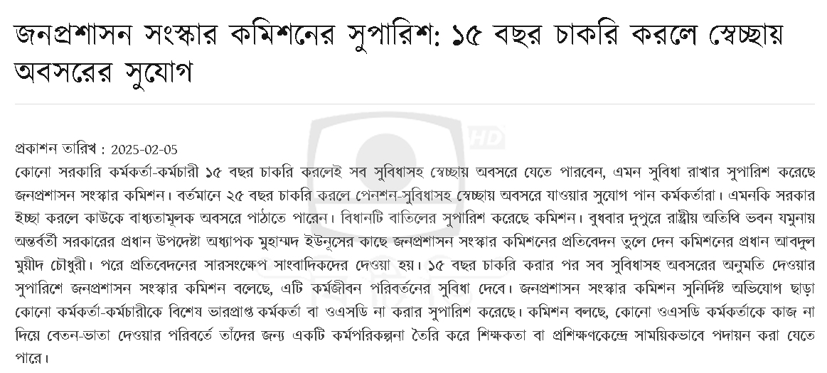 সরকারি চাকরিজীবীদের বেতন বৃৃদ্ধি নিয়ে কোন ভাল খবর না থাকলেও স্থায়ী পে কমিশন গঠনের জন্য সংস্কার কমিশন সুপারিশ করা হয়েছে -নতুন পে কমিশন ঠিক কতটা বাস্তবায়ন করে সেটি ই এখন দেখার বিষয়–সংস্কার কমিশনের সুপারিশ ২০২৫
