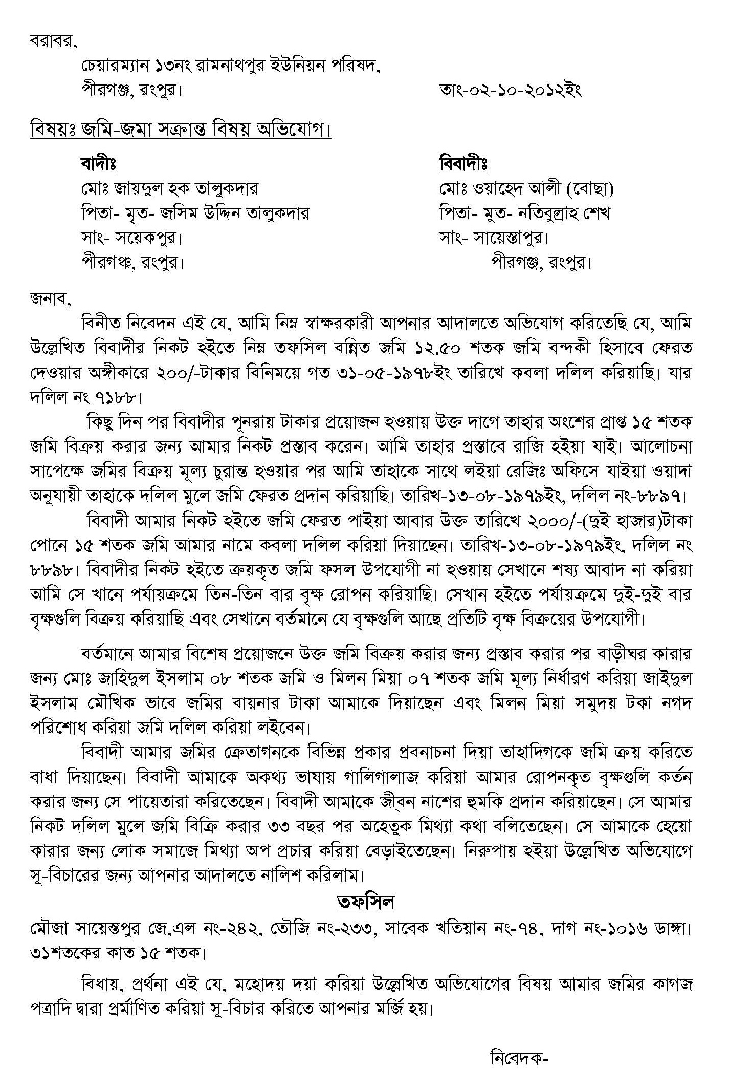 ইউপি মামলা আবেদন নমুনা কপি MS Word File