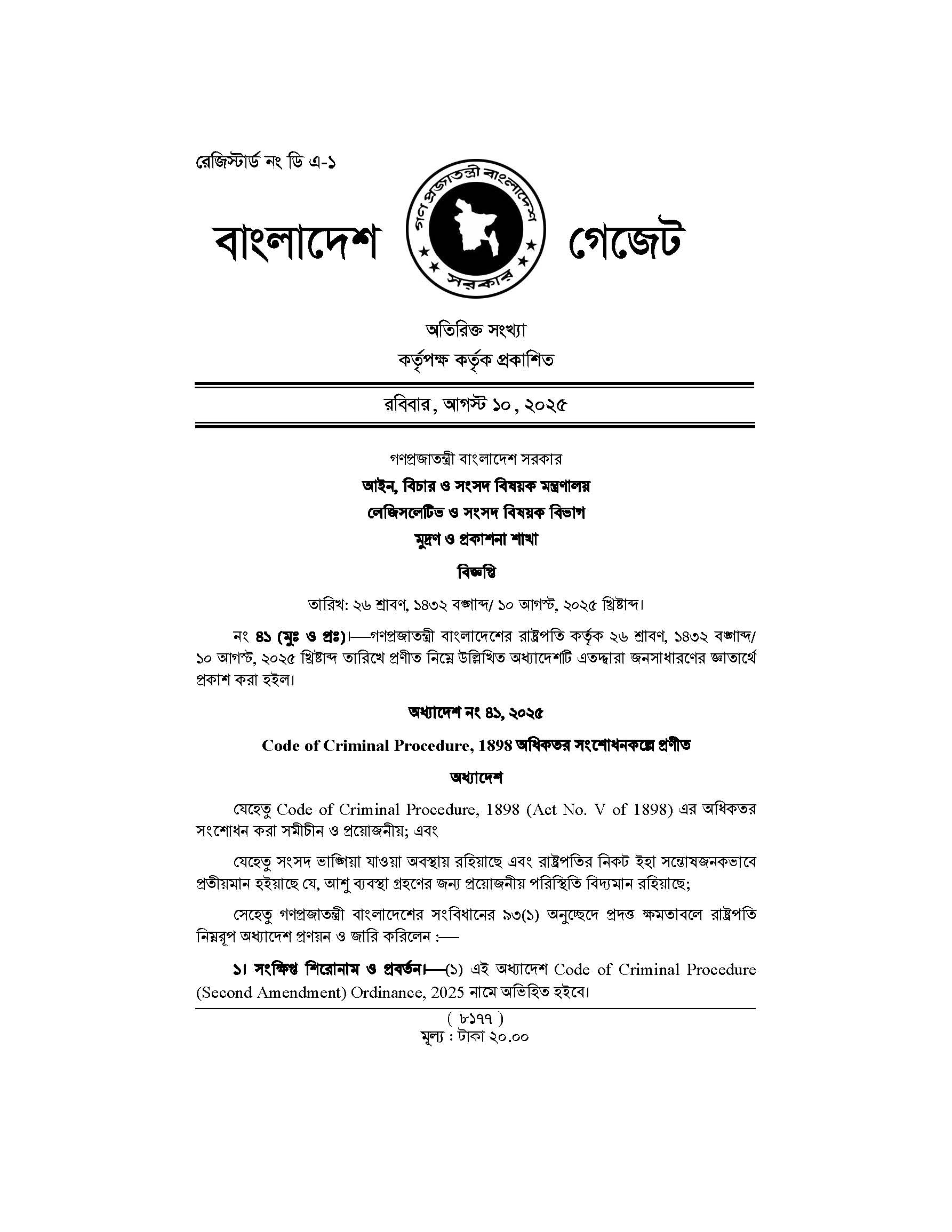 Caption: ফৌজদারি কার্যবিধি সংশোধন অধ্যাদেশ ২০২৫
