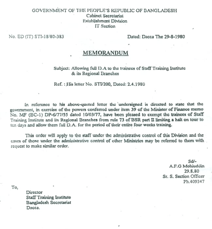 ঢাকা, ২৯ আগস্ট, ১৯৮০ – বাংলাদেশ সরকারের মন্ত্রিসভা সচিবালয়, সংস্থাপন বিভাগ, আইটি সেকশন কর্তৃক আজ এক গুরুত্বপূর্ণ স্মারকলিপি (মেমোরান্ডাম) জারি করা হয়েছে, যার মাধ্যমে স্টাফ ট্রেনিং ইনস্টিটিউট (Staff Training Institute) এবং এর আঞ্চলিক শাখাগুলোর প্রশিক্ষণার্থীদের জন্য পুরো প্রশিক্ষণ সময়কালে সম্পূর্ণ দৈনিক ভাতা (Daily Allowance – D.A.) মঞ্জুর করা হয়েছে।