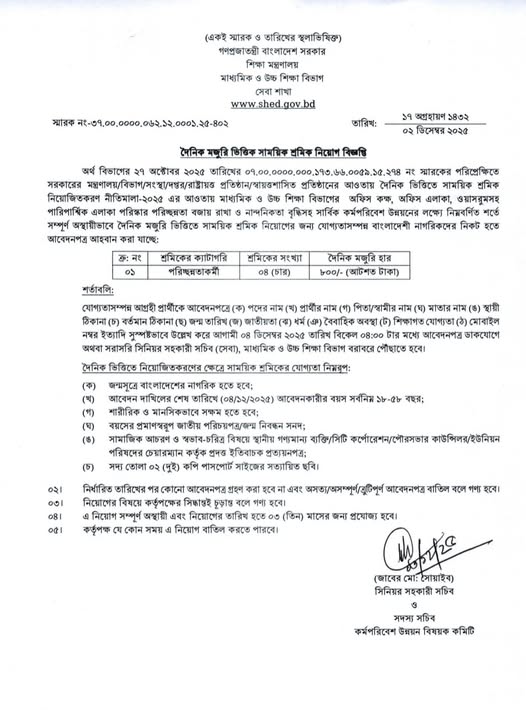 সরকারি প্রতিষ্ঠানসমূহের আওতাধীন দপ্তর, অফিস এলাকা, এবং পরিদপ্তর ও বিভাগীয়/আঞ্চলিক এলাকায় পরিচ্ছন্নতা বজায় রাখার জন্য মাধ্যমিক ও উচ্চ শিক্ষা বিভাগ (SHED) দৈনিক মজুরি ভিত্তিতে শ্রমিক নিয়োগের বিজ্ঞপ্তি প্রকাশ করেছে। এই সংক্রান্ত বিজ্ঞপ্তিটি গত ১২ ডিসেম্বর ২০২৫ তারিখে স্বাক্ষরিত হয়েছে।