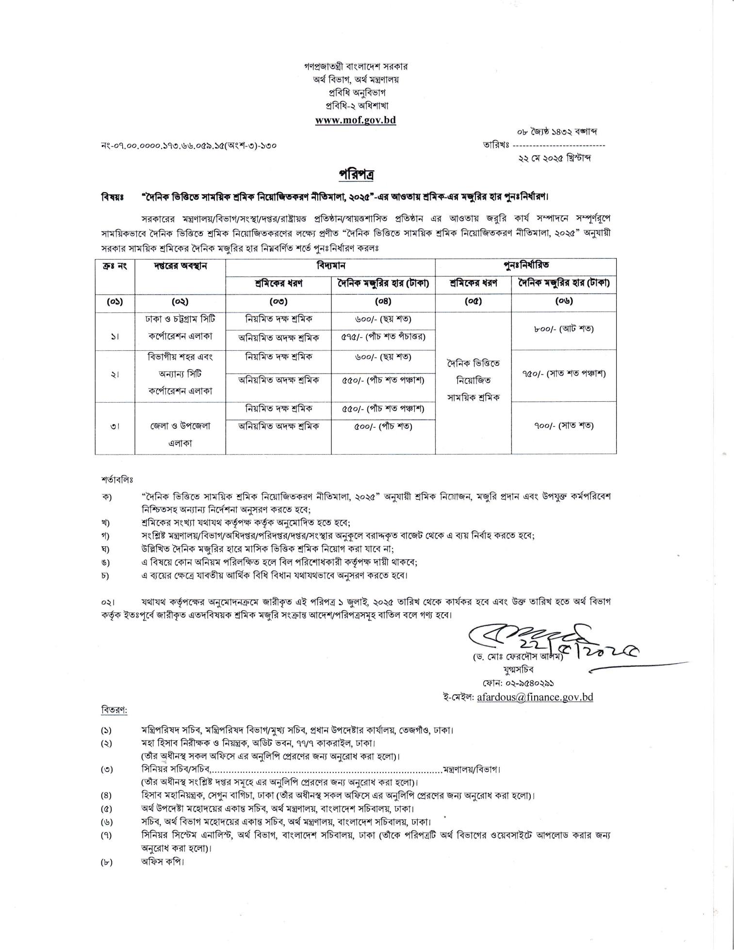 ৪. অর্থ বিভাগ কর্তৃক কেইস টু কেইস ভিত্তিতে ইত:পূর্বে যে সব দপ্তরের বিপরীতে দৈনিক ভিত্তিক শ্রমিক মজুরির হার নির্ধারণ করা হয়েছিল এ পুন: নির্ধারিত হার সেসব দপ্তরের জন্যও প্রযোজ্য হবে;