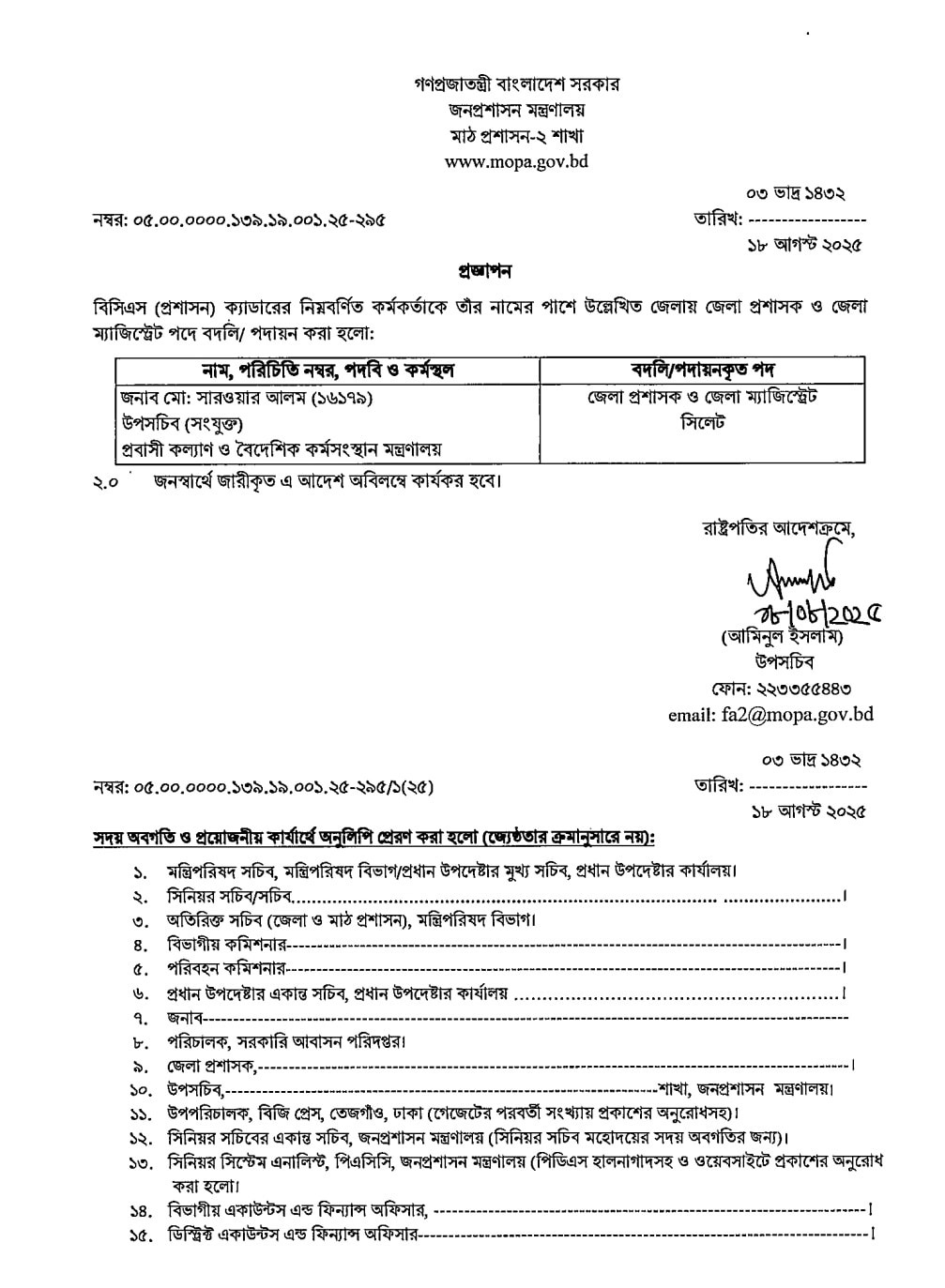 জেলা প্রশাসক পদে রদবদল ২০২৫ । সিলেট জেলায় ১ জনের ডিসি বদলির প্রজ্ঞাপন জারি হয়েছে?