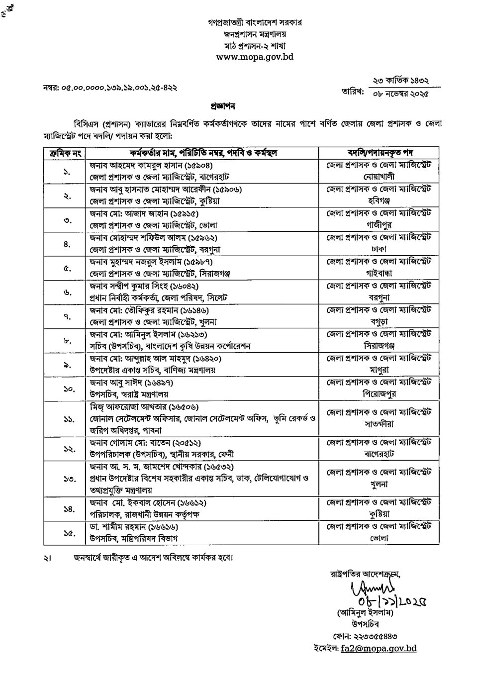 ০৯-১১-২০২৫ তারিখের জেলা প্রশাসক পদে রদবদল প্রজ্ঞাপন: ডাউনলোড