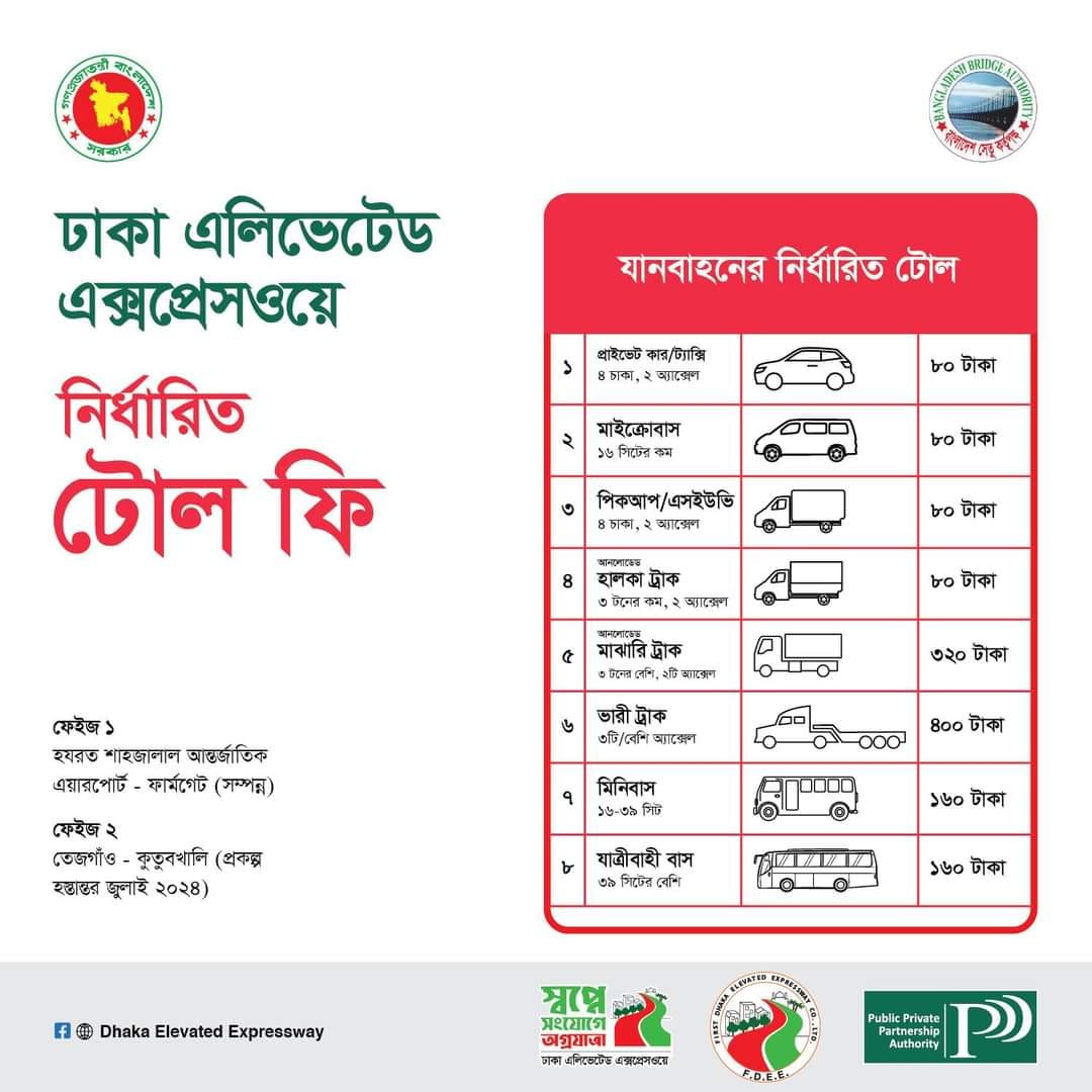 সেতু বিভাগের আওতাধীন ‘ঢাকা এলিভেটেড এক্সপ্রেসওয়ে পিপিপি প্রকল্প’-এর হযরত শাহজালাল আন্তর্জাতিক বিমানবন্দর প্রান্ত হতে ফার্মগেট প্ৰান্ত পর্যন্ত অংশের যে কোনো স্থানে উঠা-নামার জন্য অনুমোদিত যানবাহনের শ্রেণি এবং টোল হার সর্বনিম্ন ৮০ টাকা এবং সর্বোচ্চ ৪০০ টাকা নির্ধারণ করা হয়েছে।