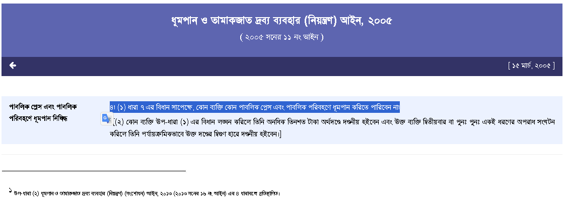ধুমপান করলে কত টাকা জরিমানা? ধূমপান ও তামাকজাত দ্রব্যের ব্যবহার নিরুৎসাহিত এবং ধূমপানমুক্ত স্থান নিশ্চিতকরণের জন্য ‘ধূমপান ও তামাকজাত দ্রব্য ব্যবহার (নিয়ন্ত্রণ) (সংশোধন)’ আইনে পাবলিক প্লেস ও পাবলিক পরিবহন বলতে কি বোঝানো হয় সেটার বিশদ বিবরণ দেওয়া হয়েছে।ধূমপান ও তামাকজাত দ্রব্য ব্যবহার (নিয়ন্ত্রণ) আইন ২০০৫ এ পাবলিক প্লেসের আওতা কম থাকায় ২০১৩-এর সংশোধিত আইনে এর পরিধি অনেক বিস্তৃত করা হয়েছে বলে মত দিয়েছেন তামাক নিয়ন্ত্রণে কাজ করা বিভিন্ন পর্যায়ের মানুষ। একই সঙ্গে এ আইনে পাবলিক প্লেস ও পাবলিক পরিবহনে ধূমপানমুক্ত সাইন স্থাপন ও নোটিশ বাধ্যতামূলক করা হয়েছে। এ আইন অমান্য করলে বিধান রাখা হয়েছে ১০০০ টাকা জরিমানার।