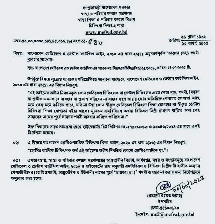 “ডাঃ” পদবী ব্যবহার নির্দেশনা ২০২৫ । MBBS এবং BDS ডিগ্রি ছাড়া ডাক্তার (ডা.) পদবী ব্যবহার করা যাবে না?