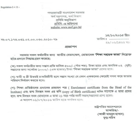 শিক্ষা সহায়ক ভাতা। Stipend help circular শিক্ষা সহায়ক ভাতা। শিক্ষা সহায়ক ভাতা গ্রহণের সময় খেয়াল রাখতে হবে যাতে স্বামী স্ত্রী দুজনেই গ্রহণ করা না হয়। দুজনেই সরকারি চাকরি করলে শুধুমাত্র একপক্ষ শিক্ষা সহায়ক ভাতা গ্রহণ করতে পারবেন। একটি সন্তানের জন্য ৫০০/- (পাঁচশত টাকা মাত্র), দুটি সন্তানের জন্য ১০০০/- (এক হাজার) টাকা গ্রহণ করা যাবে প্রতি মাসের বেতনের সাথে।