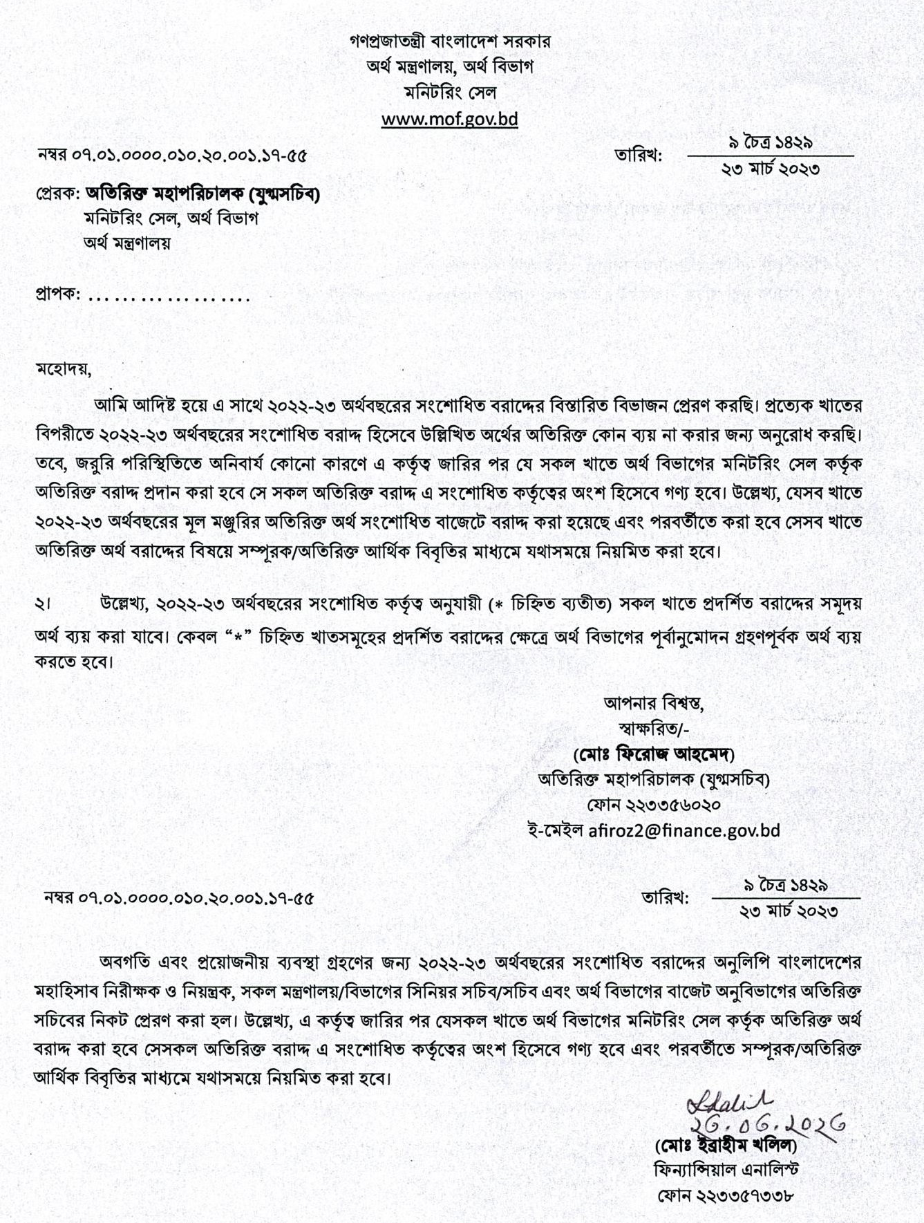 সংশোধিত বরাদ্দ ব্যয়ের নির্দেশনা- ২০২৪-২৫ অর্থবছরের সংশোধিত বরাদ্দের বিস্তারিত বিভাজন প্রেরণ করছি। প্রত্যেক খাতের বিপরীতে ২০২২-২৩ অর্থবছরের সংশোধিত বরাদ্দ হিসেবে উল্লিখিত অর্থের অতিরিক্ত কোন ব্যয় না করার জন্য অনুরোধ করছি। তবে, জরুরি পরিস্থিতিতে অনিবার্য কোনো কারণে এ কর্তৃত্ব জারির পর যে সকল খাতে অর্থ বিভাগের মনিটরিং সেল কর্তৃক অতিরিক্ত বরাদ্দ প্রদান করা হবে সে সকল অতিরিক্ত বরাদ্দ এ সংশোধিত কর্তৃত্বের অংশ হিসেবে গণ্য হবে। উল্লেখ্য, যেসব খাতে ২০২৪-২৫ অর্থবছরের মূল মঞ্জুরির অতিরিক্ত অর্থ সংশোধিত বাজেটে বরাদ্দ করা হয়েছে এবং পরবর্তীতে করা হবে সেসব খাতে অতিরিক্ত অর্থ বরাদ্দের বিষয়ে সম্পূরক/অতিরিক্ত আর্থিক বিবৃতির মাধ্যমে যথাসময়ে নিয়মিত করা হবে।