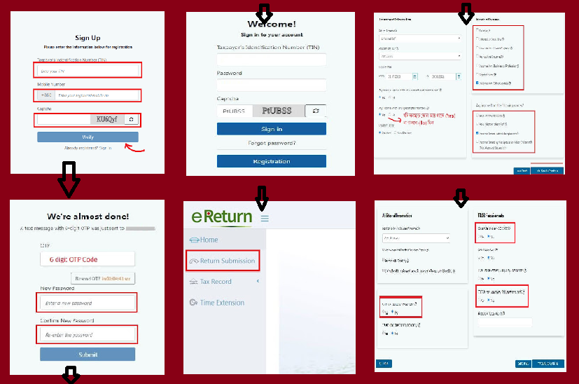 - এখানে নিজের নামে মোবাইল ফোন নম্বার দিয়ে নিবন্ধন করুন। নিবন্ধনের সময় নিজের পাসওয়ার্ড নিজে সেট করে নিন। নিবন্ধন করার সঙ্গে সঙ্গে আপনার একটি ই-রিটার্ন অ্যাকাউন্ট তৈরি হয়ে যাবে।