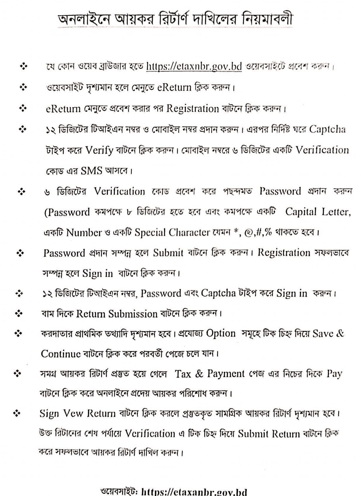 প্রথমত অনলাইনে রেজিস্ট্রেশন সম্পন্ন করতে হবে / তথ্য ইনপুট দিয়ে রিটার্ণ ফাইল তৈরি ও অনলাইনে পে করে রিটার্ণ Submit করতে হবে।