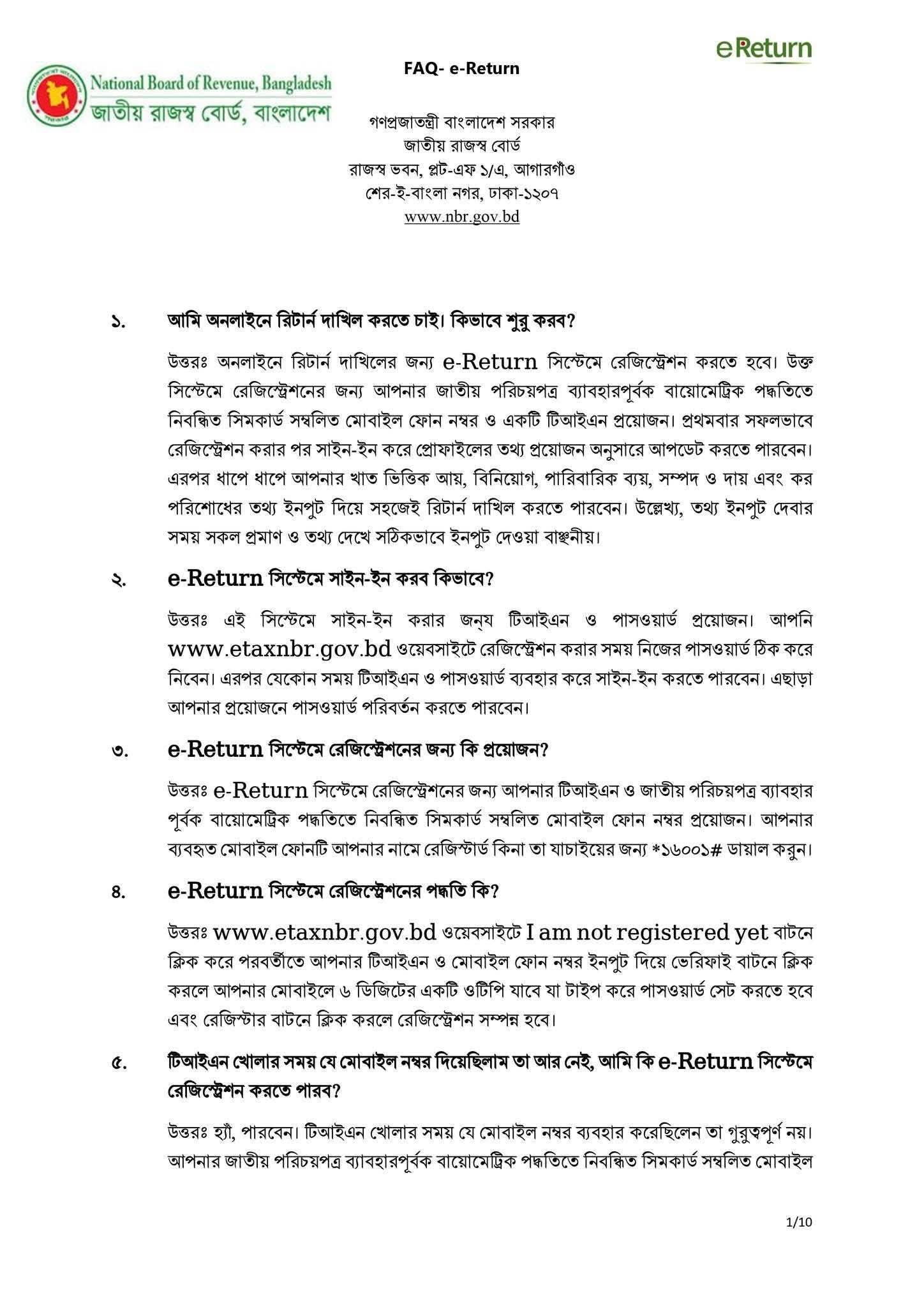 - e-Return এ আয়কর রিটার্ন জমা প্রদানের সুবিধা কি? উত্তরঃ e-Return সিস্টেমে রিটার্ন জমা দেওয়া হলে আপনি তাৎক্ষণিক নিম্নোক্ত সুবিধা পাবেন – i) ঘরে বসে আয়কর রিটার্ন দাখিল করতে পারবেন।আয়কর অফিসে যাওয়ার প্রয়োজন হবে না। ii) টিন সার্টিফিকেট প্রিন্ট/ডাউনলোড করতে পারবেন। iii) রিটার্ন ও ট্যাক্স সার্টিফিকেট প্রিন্ট/ডাউনলোড করতে পারবেন। iv) রিটার্ন জমা দেওয়ার প্রমাণ হিসেবে Acknowledgement slip ডাউনলোড করতে পারবেন। v) এই সিস্টেমের মাধ্যমে পরিশোধিত করের চালান ডাউনলোড ও প্রিন্ট করতে পারবেন। vi) এই সিস্টেমের মাধ্যমে পূর্ববর্তী বছরসমূহে কোন রিটার্ন দাখিল করা হয়ে থাকলে তার রেকর্ড প্রিন্ট এর সুবিধা পাওয়া যাবে।