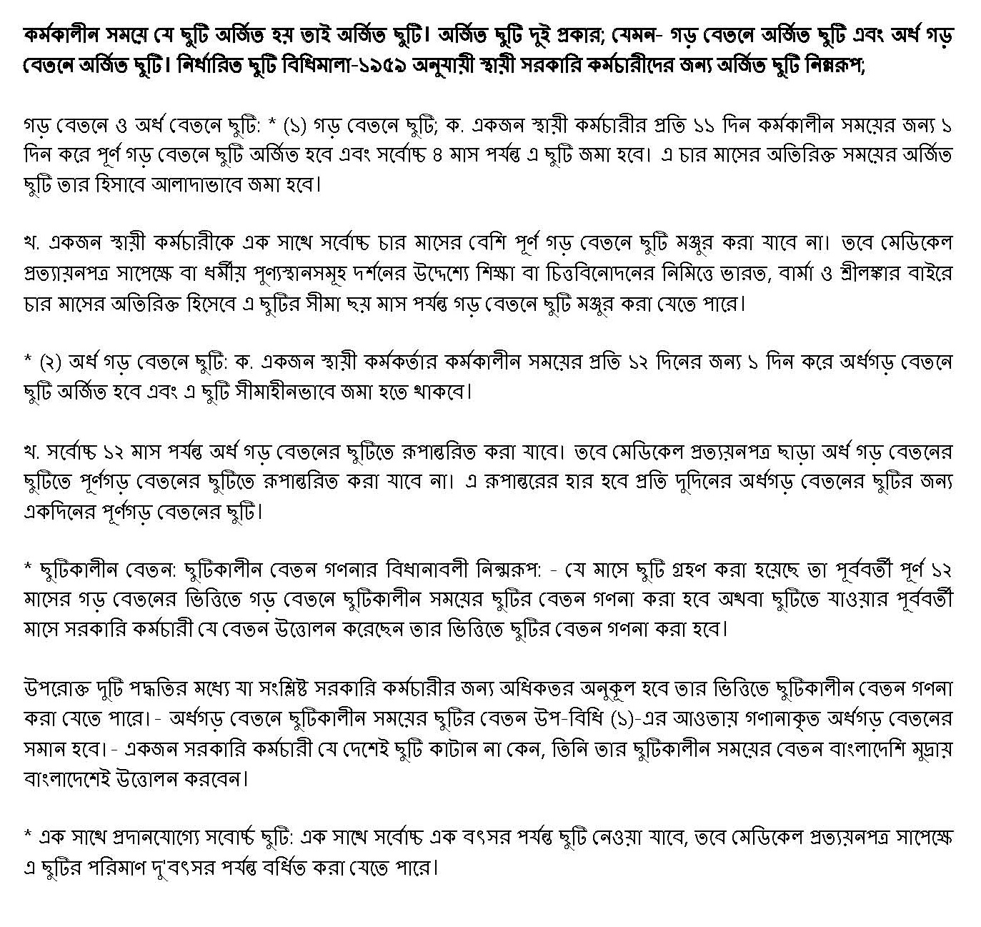 সকল স্থায়ী (পার্মানেন্ট) সরকারি কর্মচারী নিম্নবর্ণিত রূপে পূর্ণ গড়বেতনে অর্জিত ছুটি ভোগ করিতে পারিবেন: (i) কর্তব্য কর্মে অতিবাহিতকালের ১/১১ ভাড় হারে পূর্ণ গড় বেতনে ছুটি অর্জিত হইবে এবং সর্বোচ্চ ৪ (চার) মাস পর্যন্ত এই ছুটি সঞ্চিত থাকিবে। এই চারি মাসের অতিরিক্ত অর্জিত ছুটি হিসাব ছুটি খাতে পৃথকভাবে রাখা হইবে। ব্যাখ্যা: প্রেসক্রাইবড লীভ রুলস এর ইংরেজী ভাষা এবং সংশোধনী বই এর শেষে পরিশিষ্ট আকারে দেওয়া আছে। এই জমাকৃত ছুটি হইতে চিকিৎসা প্রত্যয়নপত্র সাপেক্ষে, তীর্থযাত্রা, শিক্ষা অথবা চিত্তবিনোদন ছুটির জন্য বাংলাদেশ, বার্মা, শ্রীলংকা ও ভারতের বাহিরে ছুটি ভোগকালে পূর্ণ গড় বেতনে ছুটি মঞ্জুর করা যাইবে-Earn Leave 2025