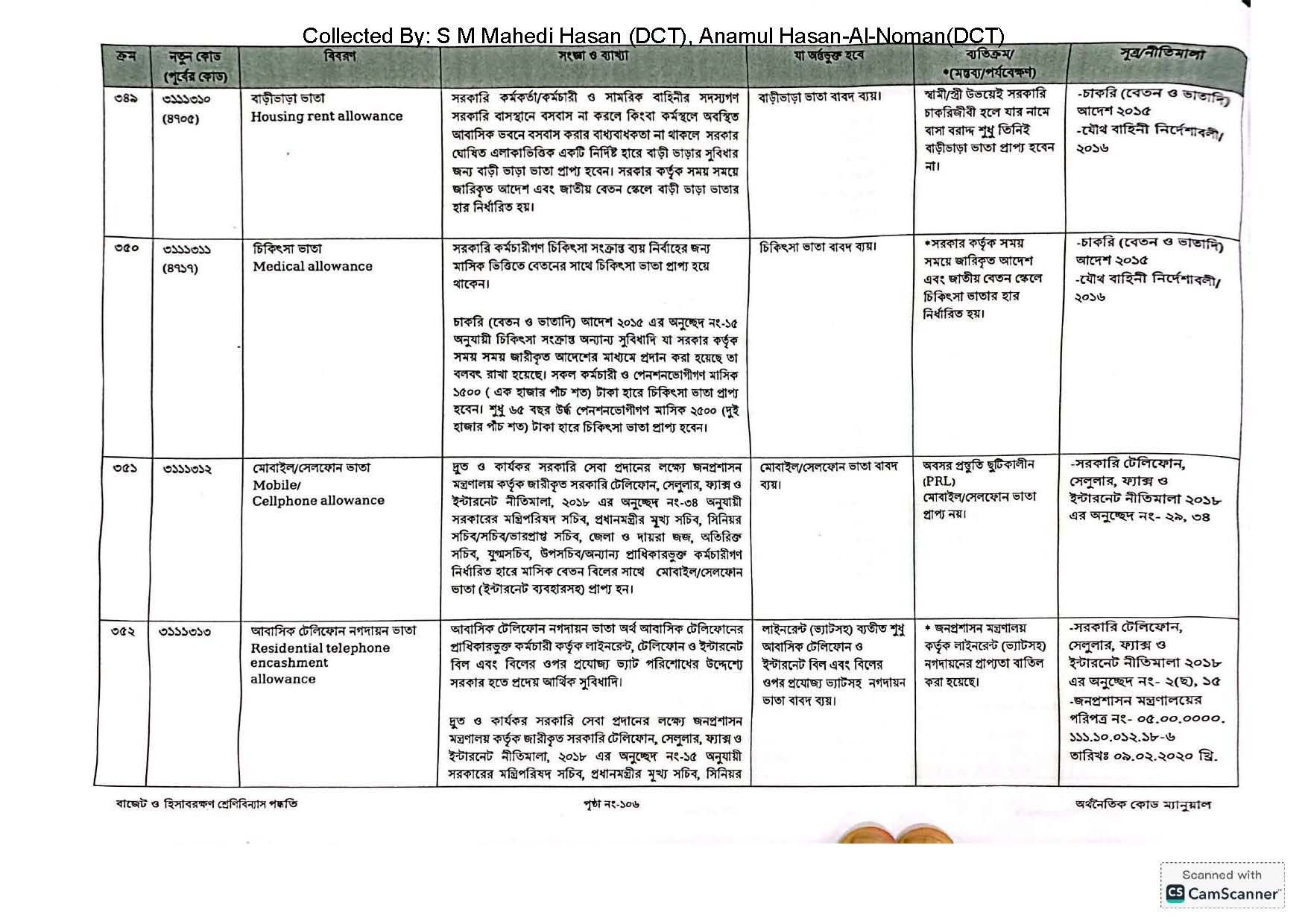- মোবাইল/সেলফোন ভাতা (কোড ৩১১১৩১২): মন্ত্রিপরিষদ সচিব, প্রধানমন্ত্রীর মুখ্য সচিব, সিনিয়র সচিব/সচিব/ভারপ্রাপ্ত সচিবসহ অন্যান্য প্রাধিকারভুক্ত কর্মচারীগণ নির্ধারিত হারে মাসিক বেতন বিলের সাথে এই ভাতা (ইন্টারনেট ব্যবহারসহ) প্রাপ্য হন।