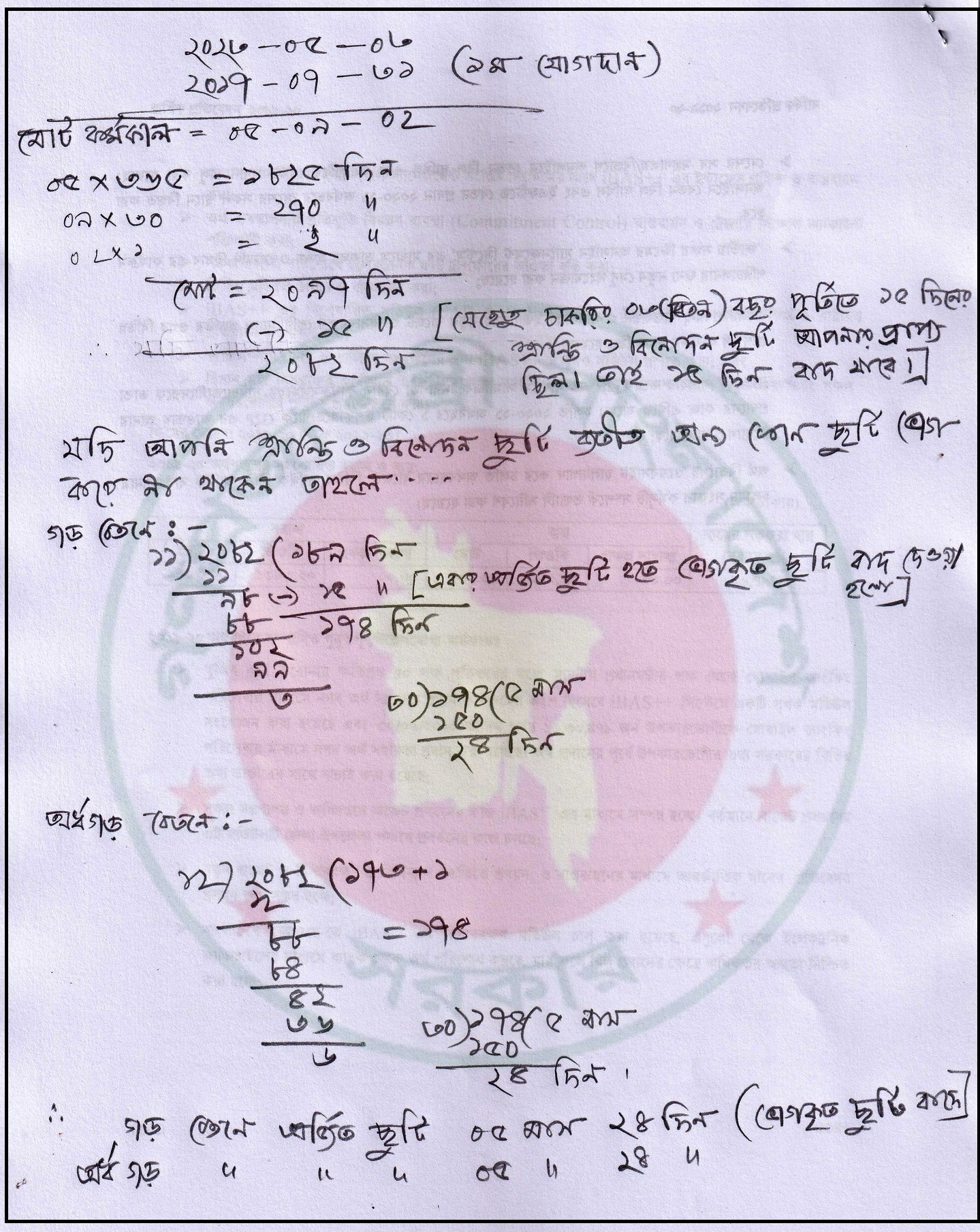 (৫মাস+১৫দিন+৬মাস+৩মাস) = ১ বছর ২ মাস ১৫ দিন ছুটি ভোগ করেন। এখানে গড় বেতনে, অর্ধ গড় বেতনেসহ সকল ছুটি অর্ন্তভূক্ত হবে।
