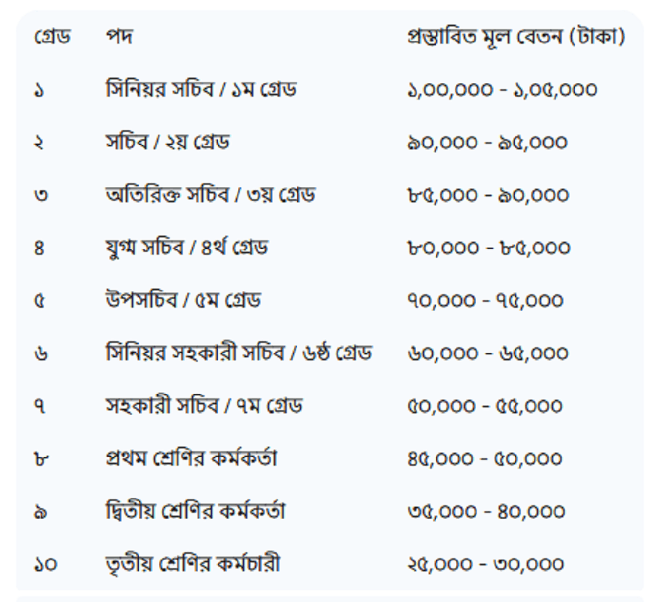 ১০ গ্রেডে বেতন কাঠামো ২০২৫ । এটি কোন সরকারি সিদ্ধান্ত নয়। বিভিন্ন সংগঠনের দাবী অনুসারে প্রস্তুত করা হয়েছে।