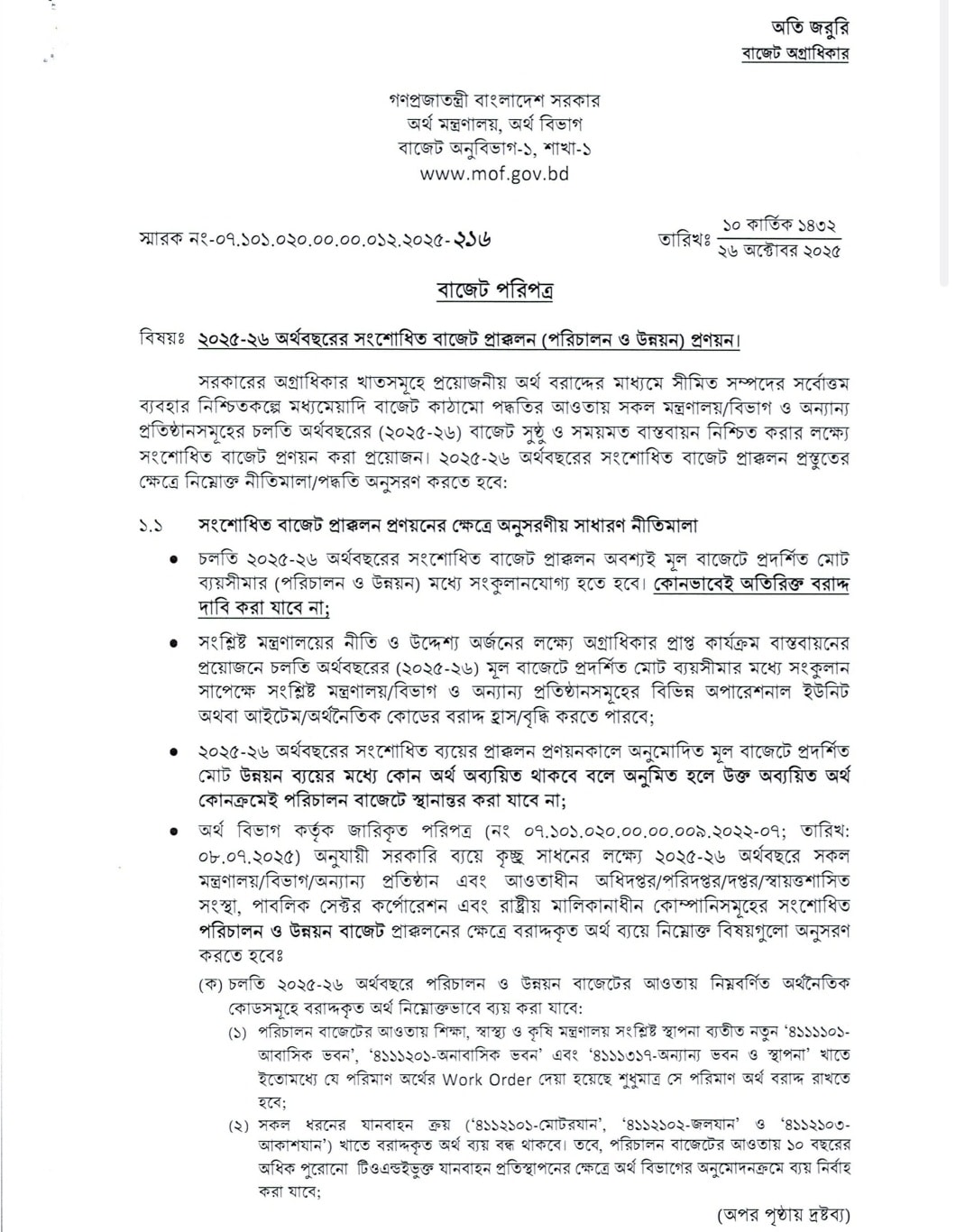 অর্থ মন্ত্রণালয়ের বাজেট পরিপত্র জারি; ভবন ও যানবাহন ক্রয়, এবং বৈদেশিক ভ্রমণ বন্ধের ঘোষণা- গণপ্রজাতন্ত্রী বাংলাদেশ সরকারের অর্থ মন্ত্রণালয় ২০২৫-২৬ অর্থবছরের সংশোধিত বাজেট প্রাক্কলন (পরিচালন ও উন্নয়ন) প্রণয়নের জন্য ‘অতি জরুরি’ ভিত্তিতে একটি বাজেট পরিপত্র জারি করেছে। সীমিত সম্পদের সর্বোত্তম ব্যবহার এবং মধ্যমেয়াদি বাজেট কাঠামোর আওতায় বাজেট সুষ্ঠু ও সময়মতো বাস্তবায়নের লক্ষ্যে এই সংশোধিত বাজেট প্রস্তুত করা জরুরি বলে পরিপত্রে উল্লেখ করা হয়েছে । এই প্রক্রিয়ায় ব্যয় সংকোচনের মাধ্যমে সরকারি ব্যয়ে কৃচ্ছ্র সাধন নিশ্চিত করতে কতিপয় কঠোর নীতিমালা ও দিকনির্দেশনা অনুসরণ করতে বলা হয়েছে ।
